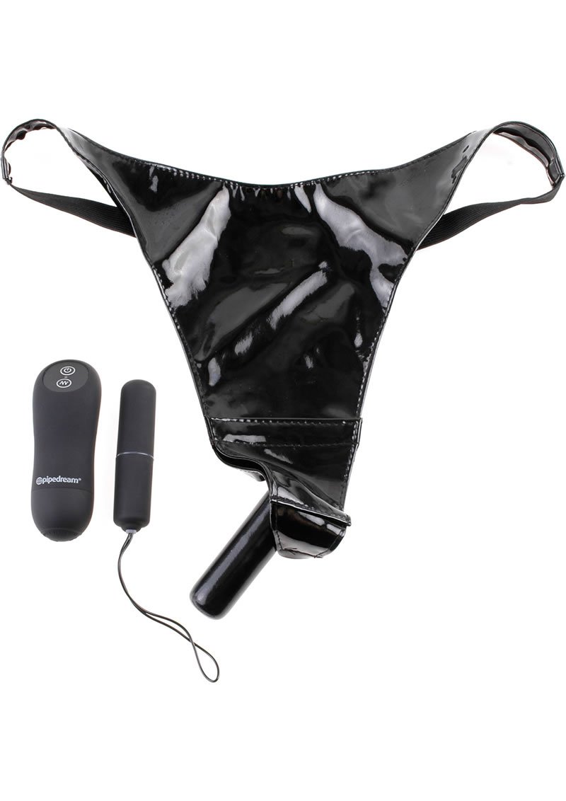 Turn your lover on with the touch of a button with the 20-Function Remote Fantasy Panty. Tucked away discreetly inside this sexy patent PVC G-string is a powerful waterproof bullet, operated by a wireless remote that is effective up to 25 feet away.A sleek vinyl plug s inside of you and quietly holds the bullet in place, delivering thrilling vibrations where you want them most without anyone knowing what you`re smiling about. With 20 pulsation patterns to choose from on the remote, the pleasure possibilities are endless and so is the fun.Tease your lover from across the room or act out your most naughty role-playing fantasies. Go from a flutter to a throb with the push of a button and don`t worry about a thingits your sexy little secret! Wear the panties out on dates, around the house, to parties, or the grocery store, or any time you need an extra little buzz. You`ll both agree, these are no ordinary panties…Finally, a remote control you can both enjoy! With your lover in control of your satisfaction, you`ll be on your best behavior if you want them to push the magic button and activate the mind-blowing vibrations. Try it alone for a sexy solo session and you`ll love being in control of your climax!The soft panty fabric feels great against your skin and stretches to comfortably fit up to a 44 waist. Cleanup is a snap after the fun with Pipedream Toy Cleaner and warm water. Apply plenty of Moist lube for an extra wet, extra wild encounter.- Includes: PVC Fantasy Panty, Waterproof Bullet, Waterproof Wireless Remote Control, Free Satin Love Mask- Requires 1 A23 (12V) Battery (Included) and 2 AAA Batteries (Not Included)- Material: Vinyl, PVC, Elastic, ABS, Plastic