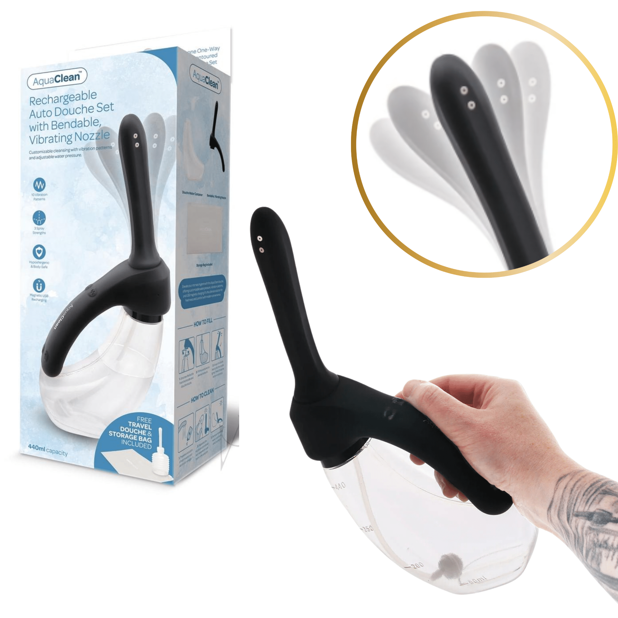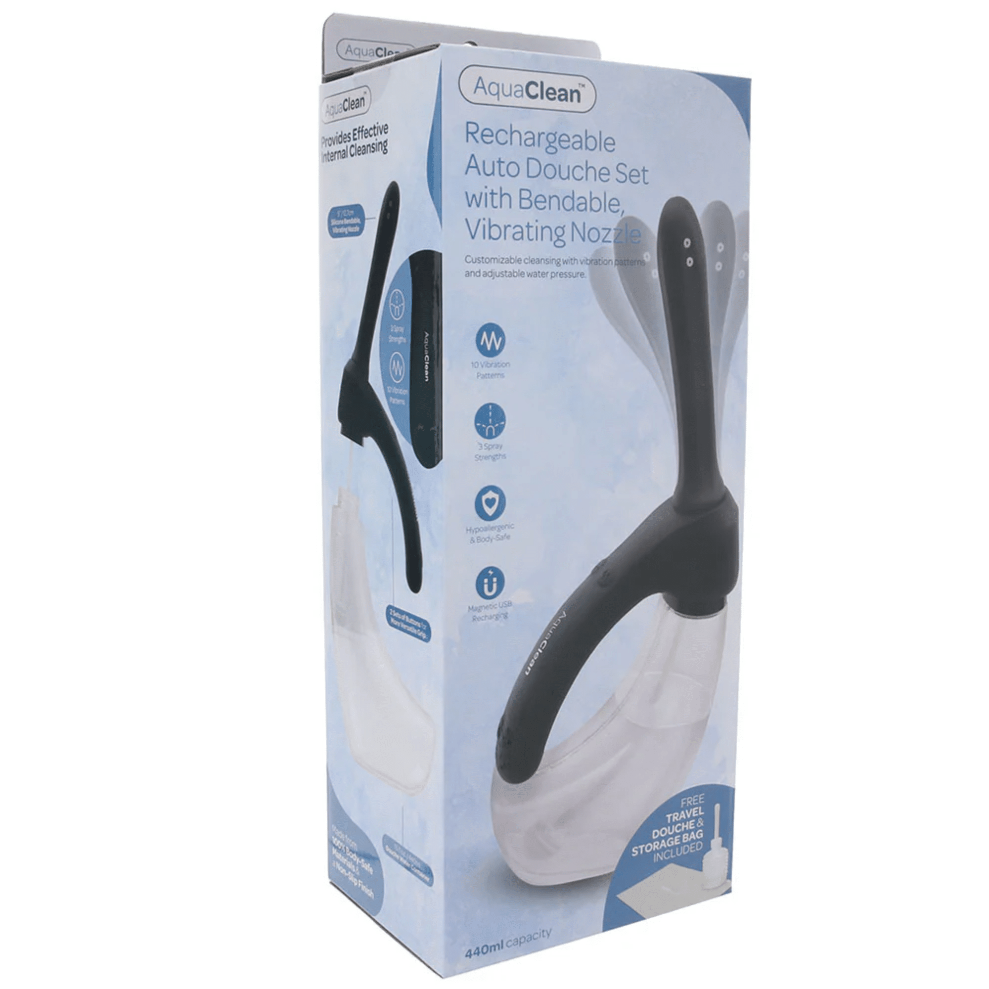 The Aqua Clean douche set includes a generous 440ml water container, allowing for extended use, and a handle with two sets of buttons for a versatile grip. Additionally, this set comes with a travel-friendly compact douche and a storage bag, making it perfect for on-the-go cleanliness.