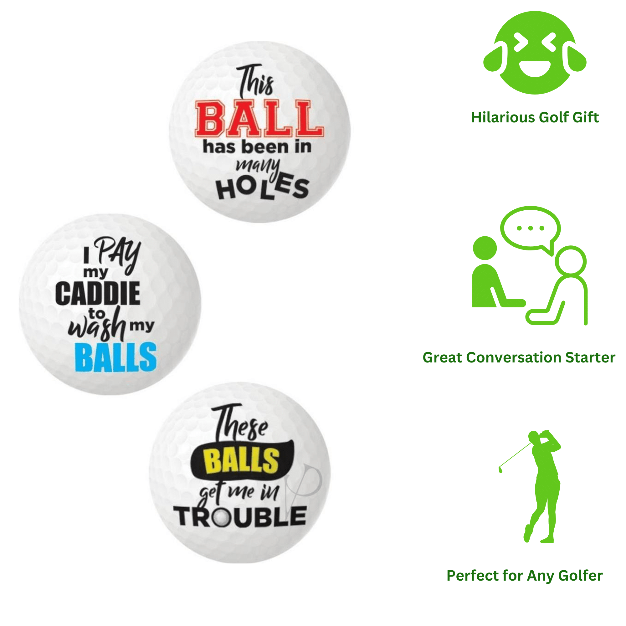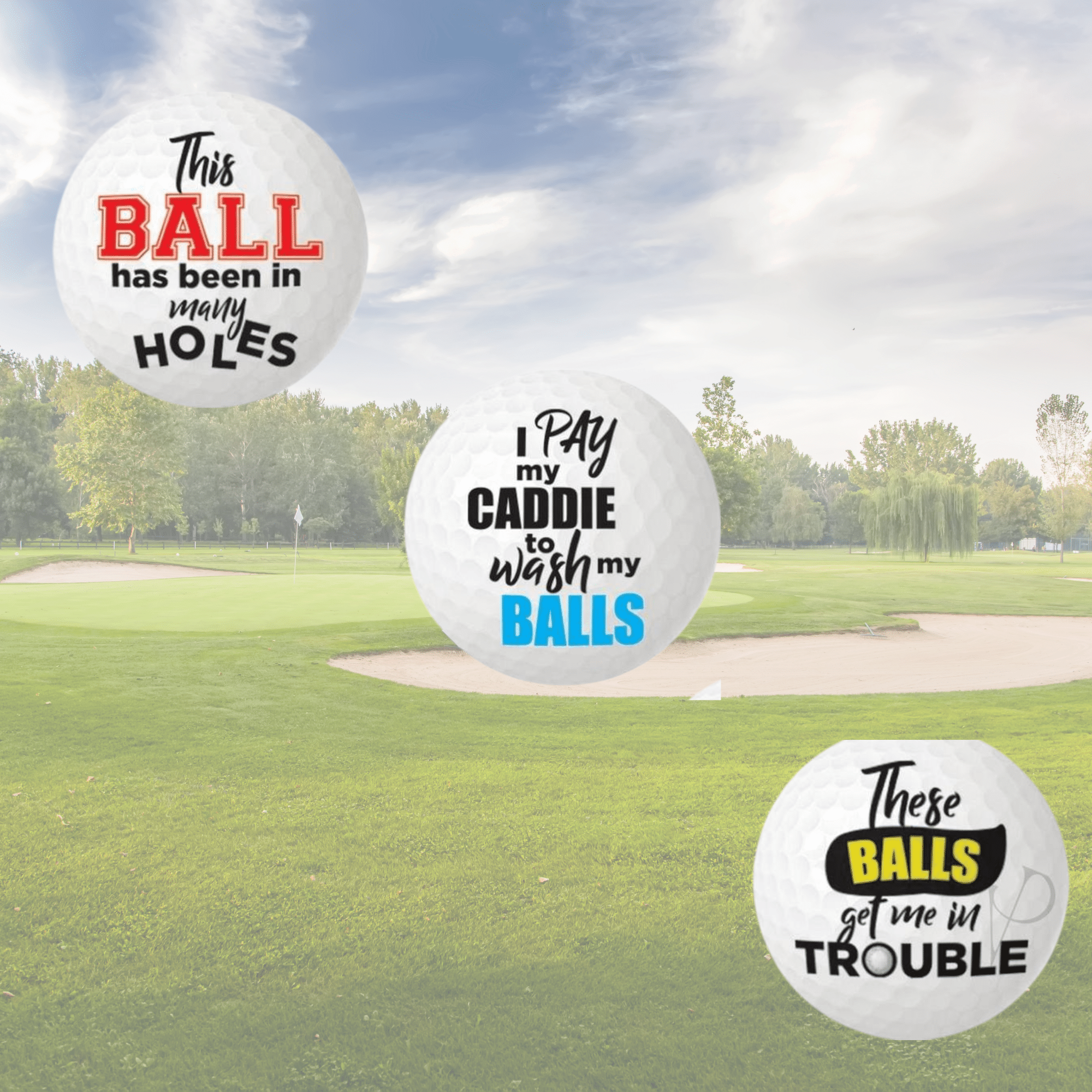 Each set of Balls Deep Slogans Novelty Golf Balls with Funny Sayings includes three high-quality golf balls, each printed with a bold and witty phrase that’s sure to turn heads: