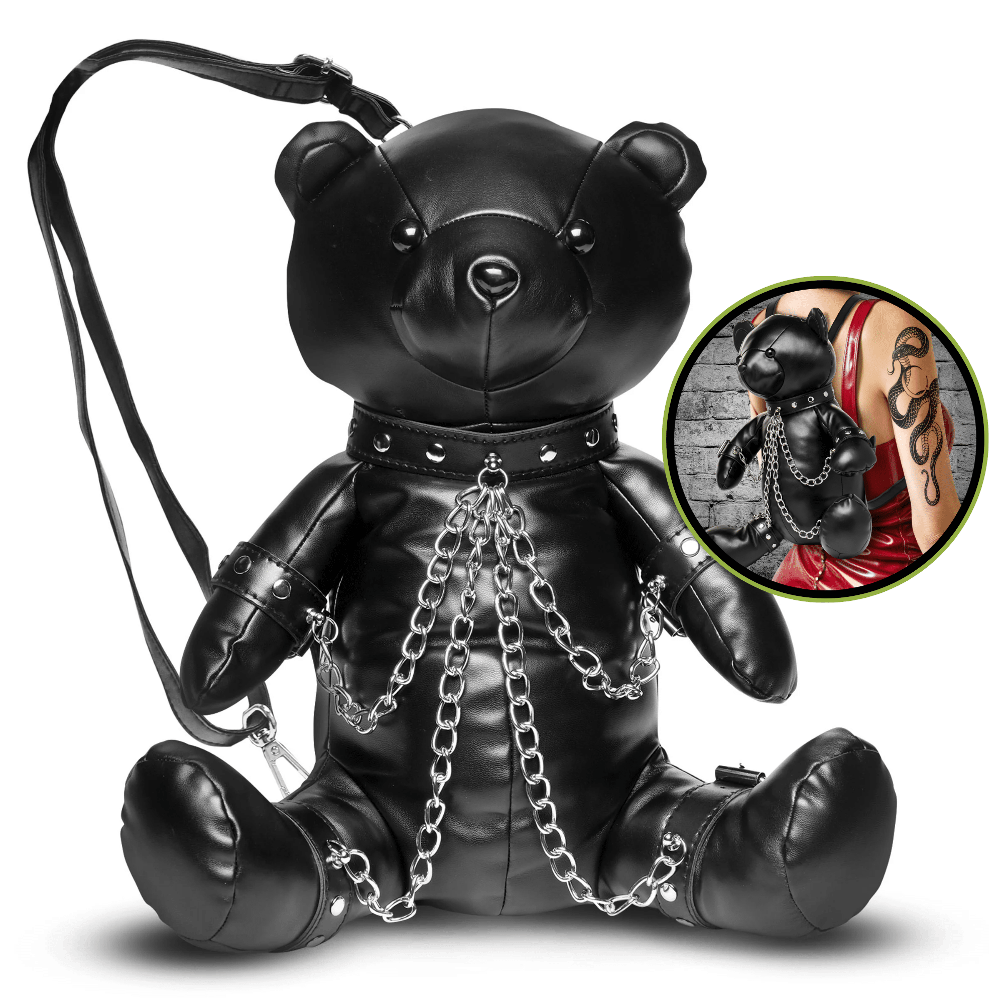 Make a bold fashion statement with the BDSM Bear Adjustable Backpack Novelty Gag Gift – a one-of-a-kind accessory that blends playful charm with edgy style. Crafted from ultra-soft plush material, this all-black gimp bear features striking vegan leather bondage gear, complete with a collar, wrist and ankle cuffs, and shimmering silver chains for that unmistakable alternative aesthetic.