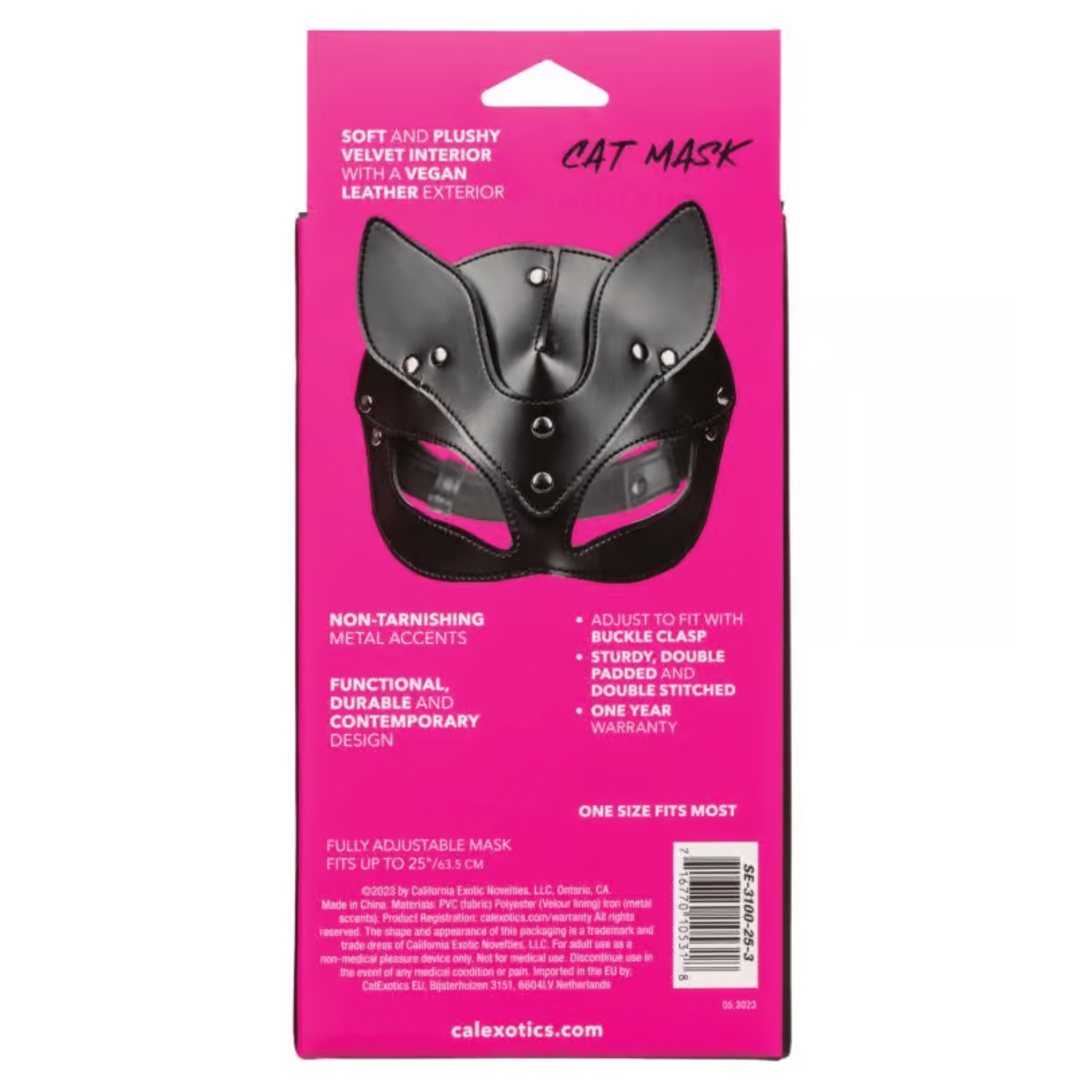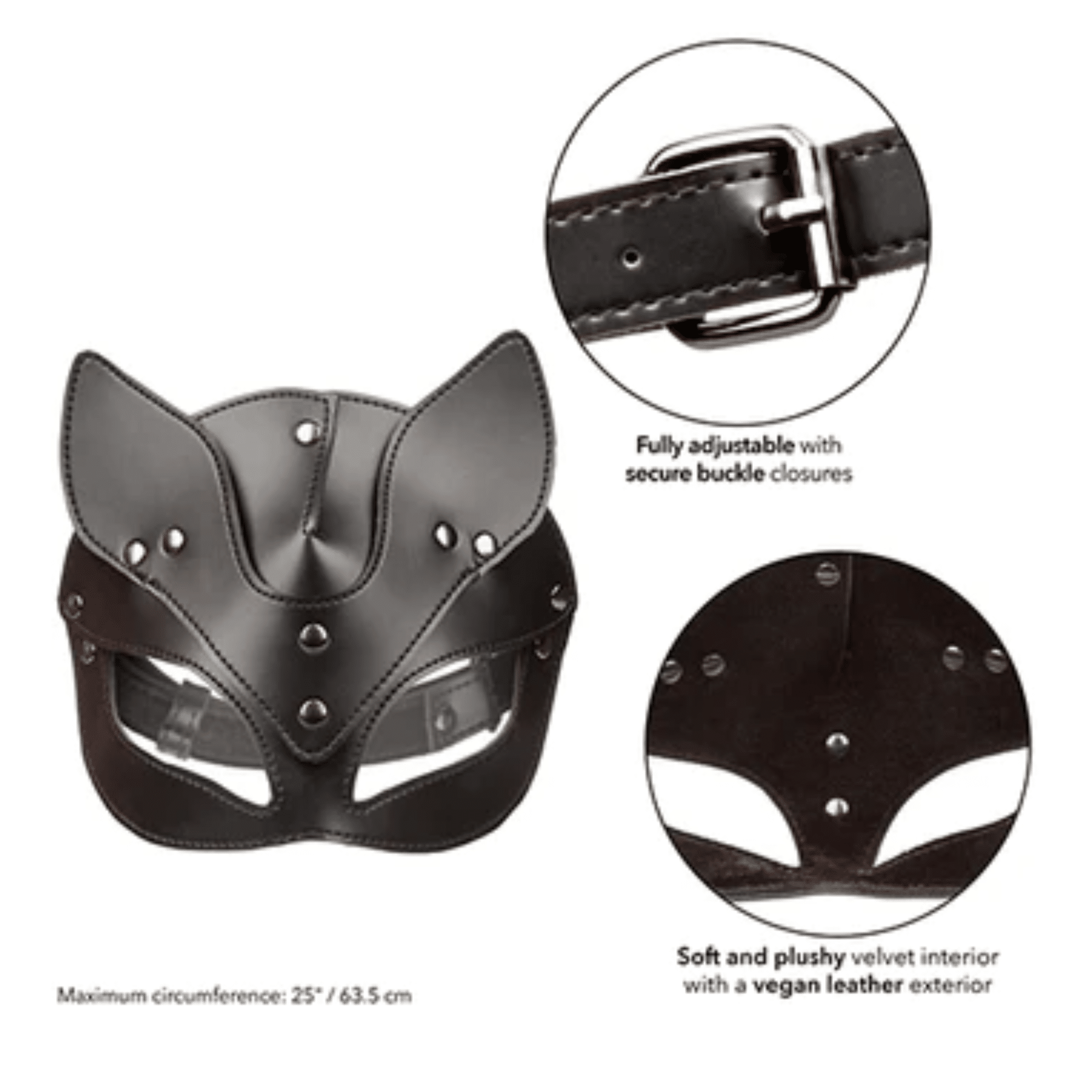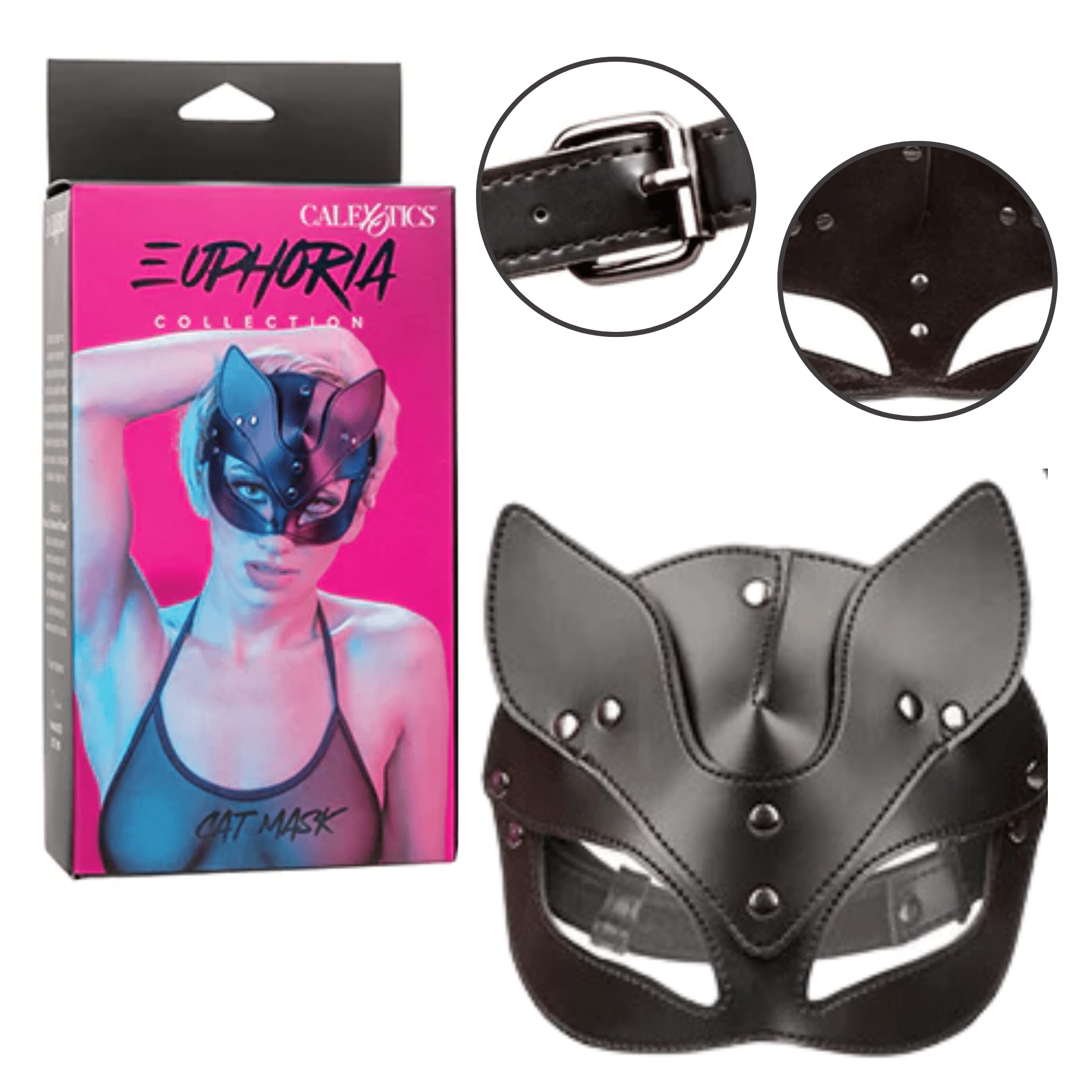 Introducing the Euphoria Collection Cat Mask, an irresistible accessory designed to ignite your imagination and elevate your intimate encounters. This captivating mask features a secure buckle closure, guaranteeing a comfortable and adjustable fit for hours of playful exploration. Meticulously crafted with both function and durability in mind, the cat mask boasts a soft velvet interior and a sleek vegan leather exterior. The combination of textures creates a sumptuous sensation against your skin, enhancing your sensory experience.