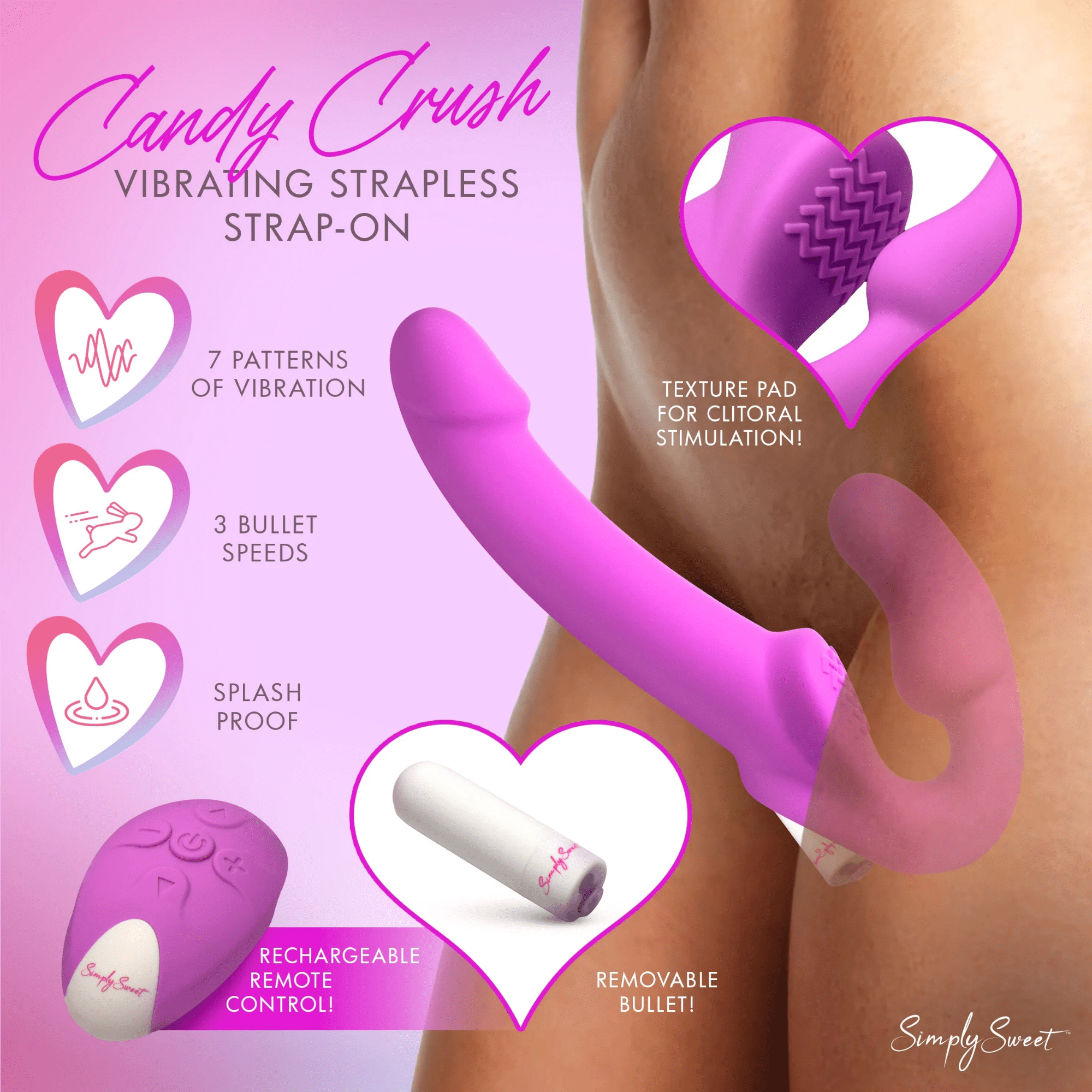 Experience deeper connection, intensified intimacy, and effortless control with the Candy Crush Vibrating Strapless Strap-On. Designed for partners who crave a shared sensual experience, this strapless strap-on offers hands-free play powered by your own kegel muscles—giving you the freedom to thrust, tease, and explore without the need for straps or harnesses. Crafted with an ergonomic shape and made from silky smooth premium silicone, the Candy Crush Vibrating Strapless Strap-On glides against the body with ease. Its long, curved shaft provides generous reach for deeply satisfying penetration, while the bulb stays comfortably in place, fitting naturally within your curves for stability and pleasure.