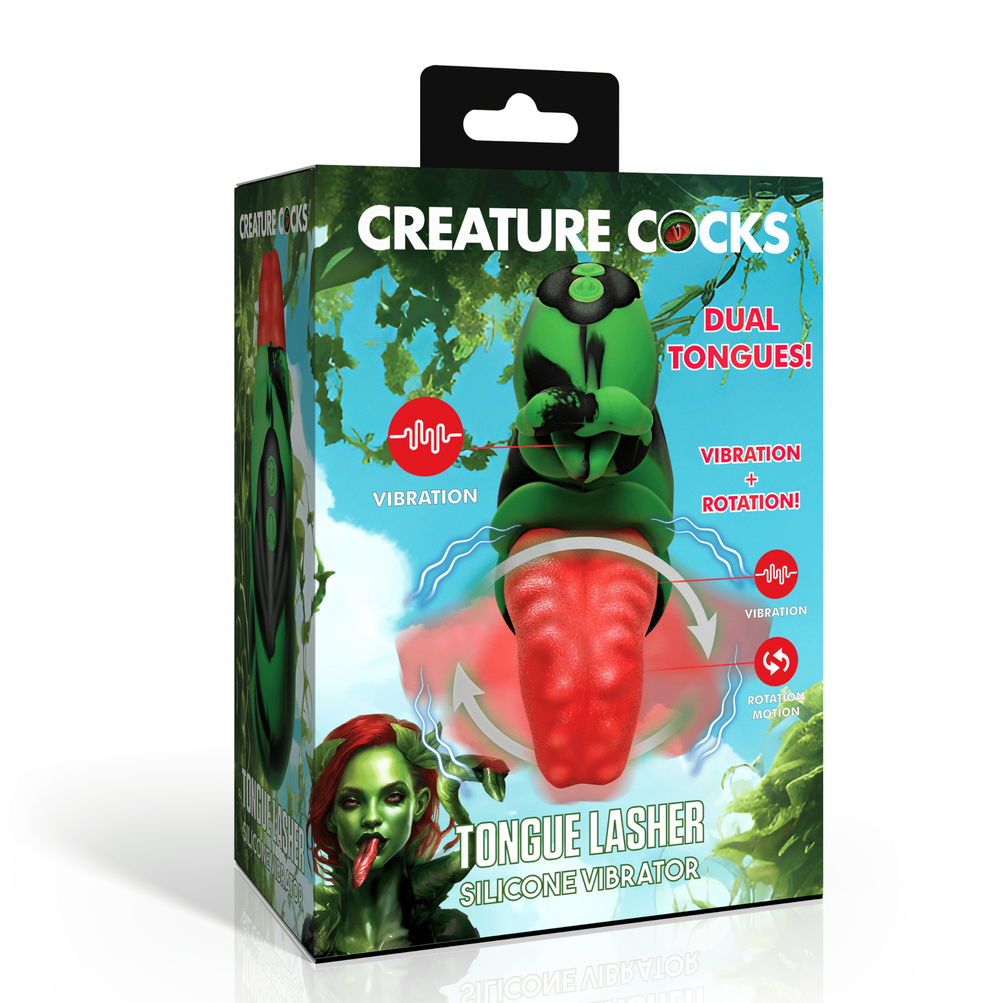 Lose yourself in a world of electrifying pleasure with the Creature Cock Tongue Lasher Fantasy Silicone Vibrator. Designed to heighten your deepest desires, this dual-action toy delivers an out-of-this-world experience. Its seductive black and green body features two tantalizing mouths—one to tease your clit and another with a bright red, textured tongue ready to explore within.