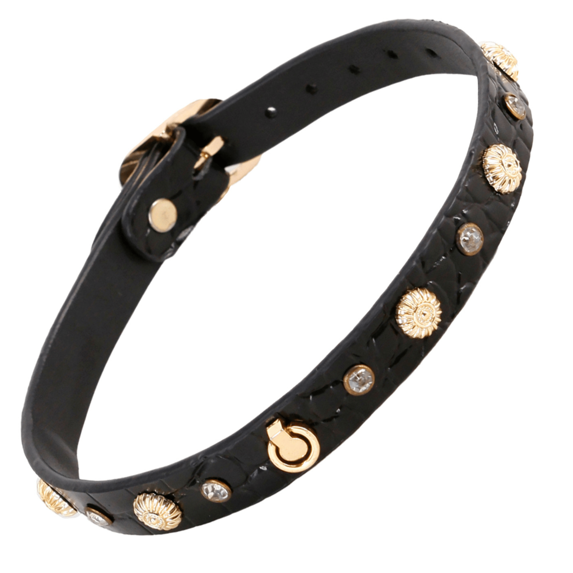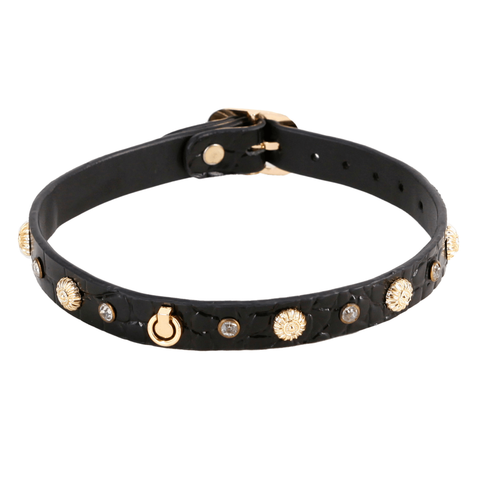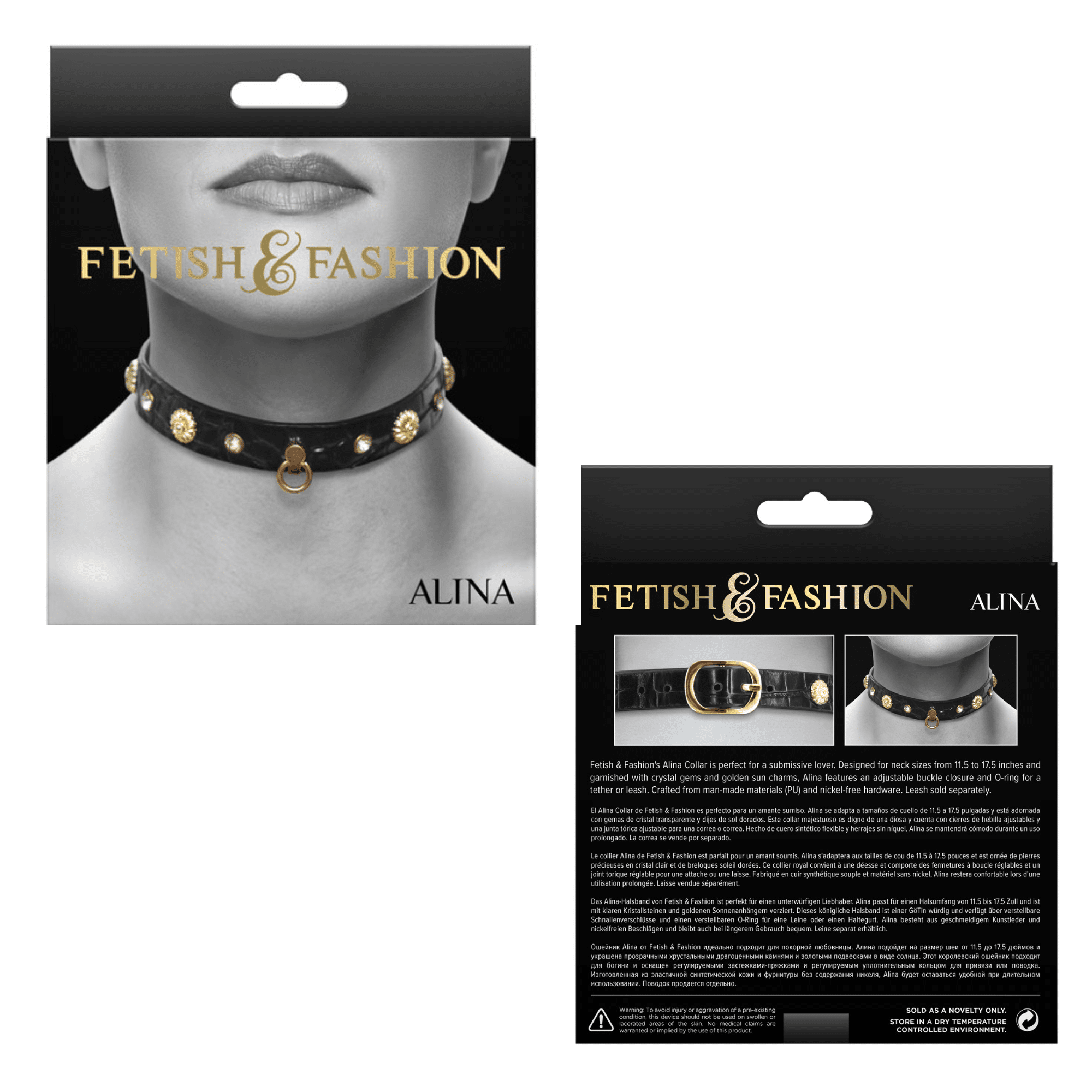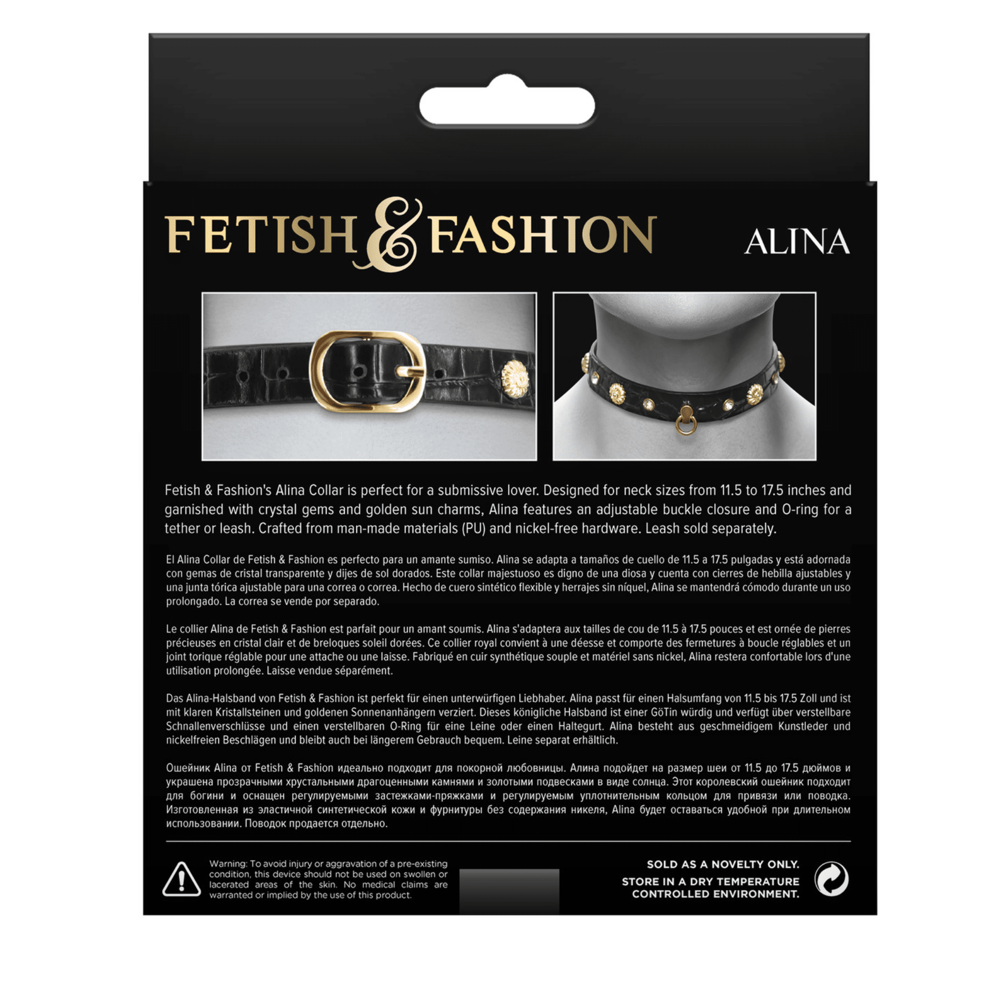 Fetish & Fashion’s Alina Collar is perfect for a submissive lover. Designed for neck sizes from 11.5 to 17.5 inches and garnished with crystal gems and golden sun charms, Alina features an adjustable buckle closure and an O-ring for a tether or leash. Crafted from man-made materials (PU) and nickel-free hardware. The leash is sold separately.