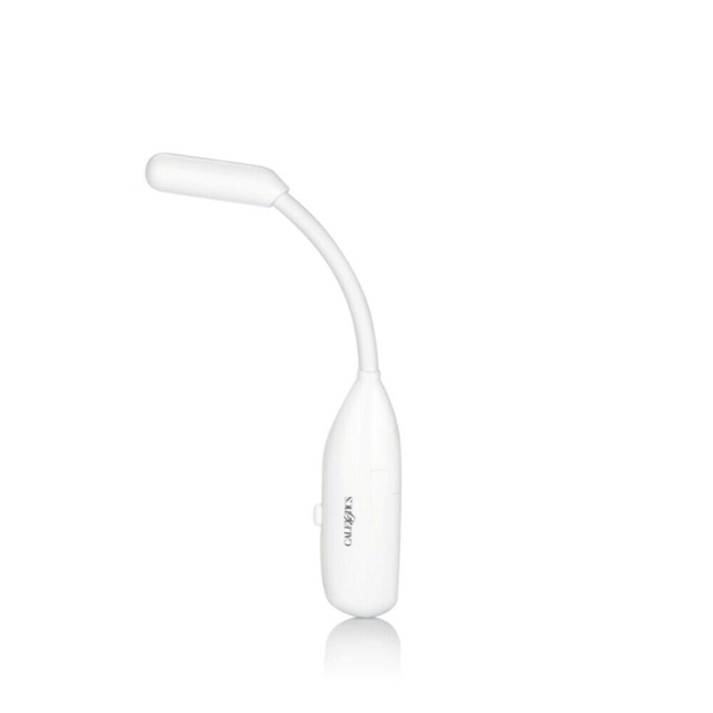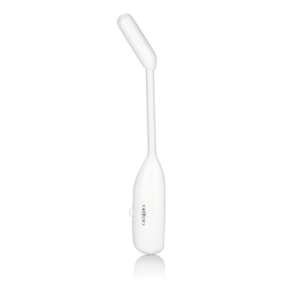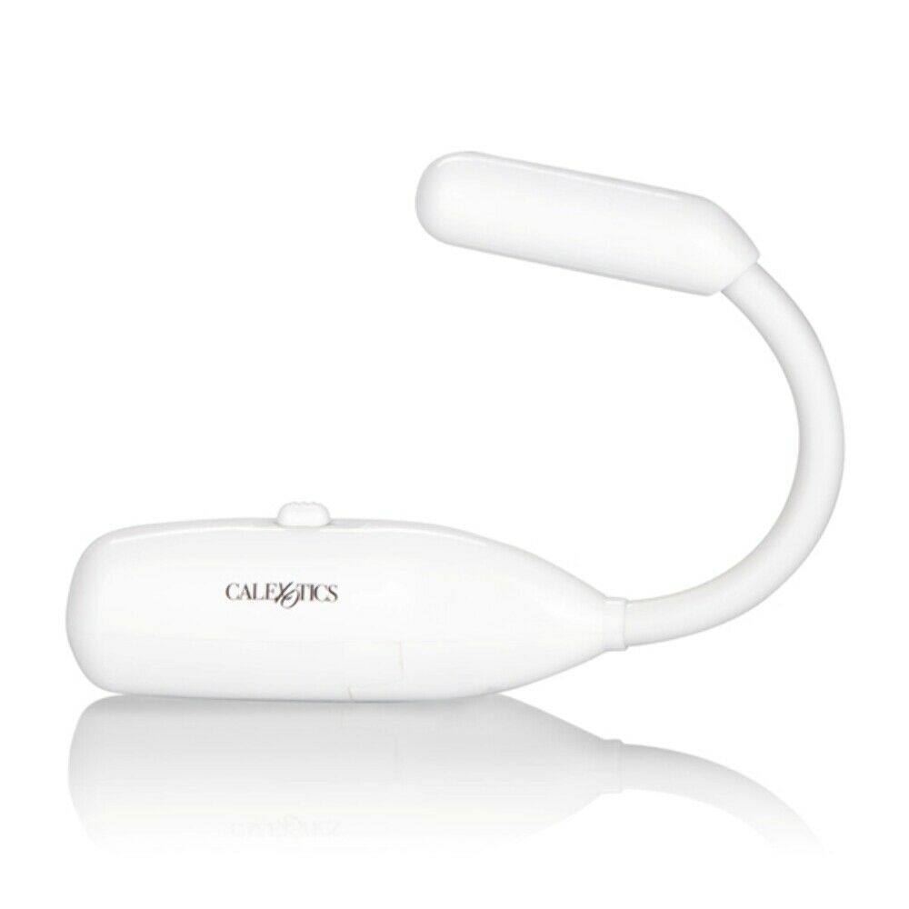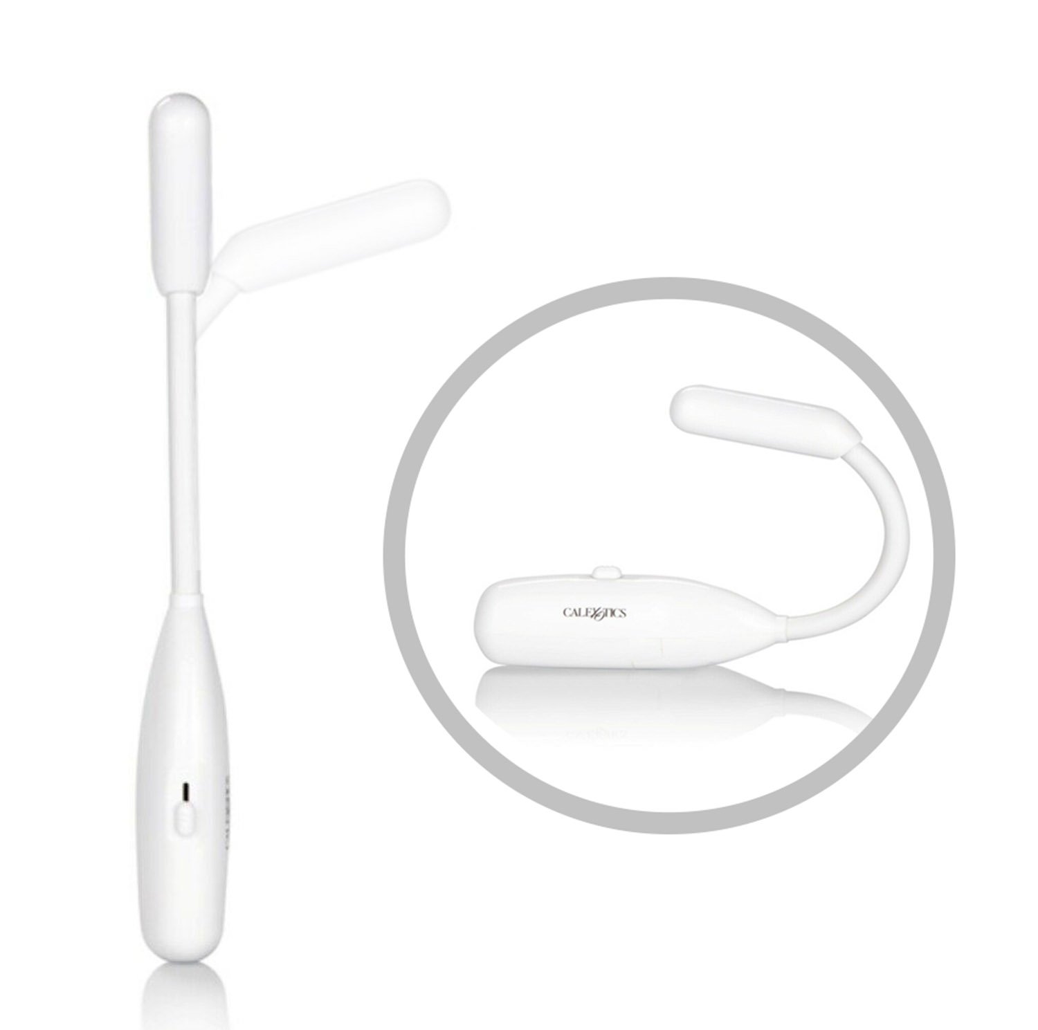 The entire item is 14 inches long. From the top of the flex-o-pleaser to the handle it is 8 inches long. The head is about 3 x 1 inch long. The shaft is very flexible and will bend to incredible angles. Requires 2C batteries (not included).