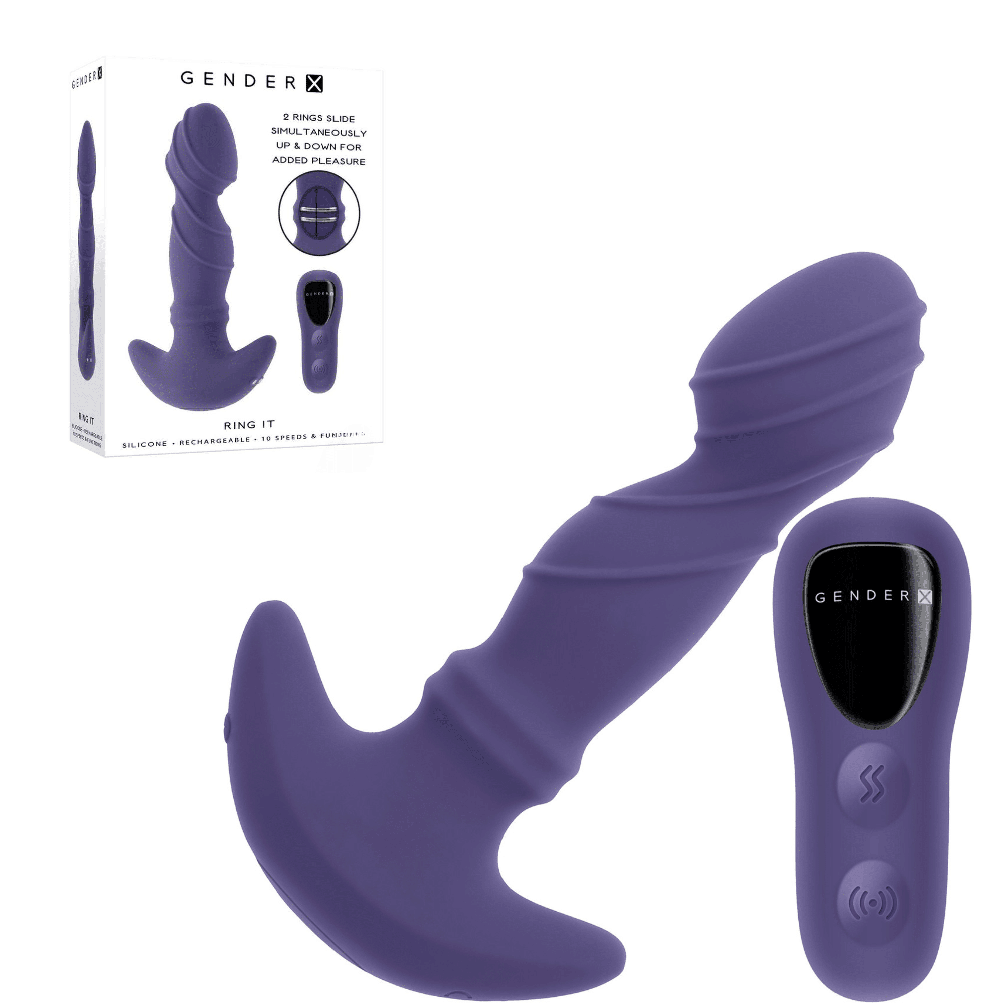The deeply-textured Gender X Ring It features a prominent angled head and two sliding rings at its base that glide up and down in multiple speeds. Designed for maximum pleasure and comfort, this innovative anal plug is perfect for those looking to enhance their intimate experiences.