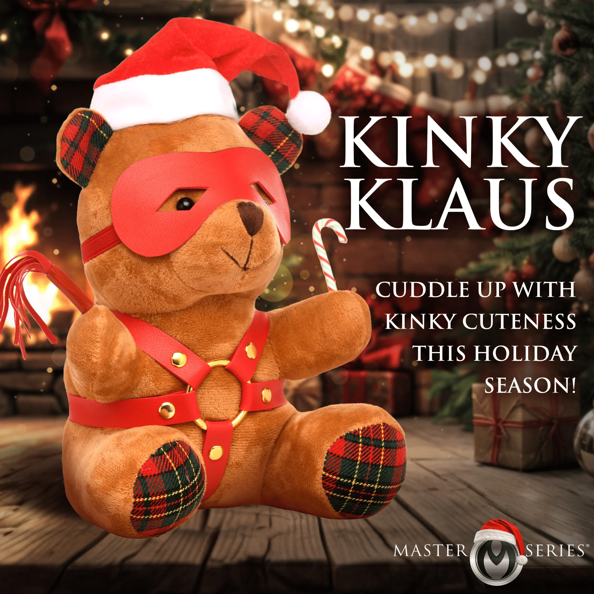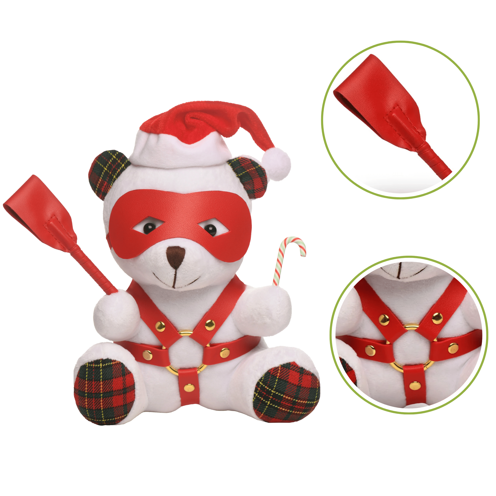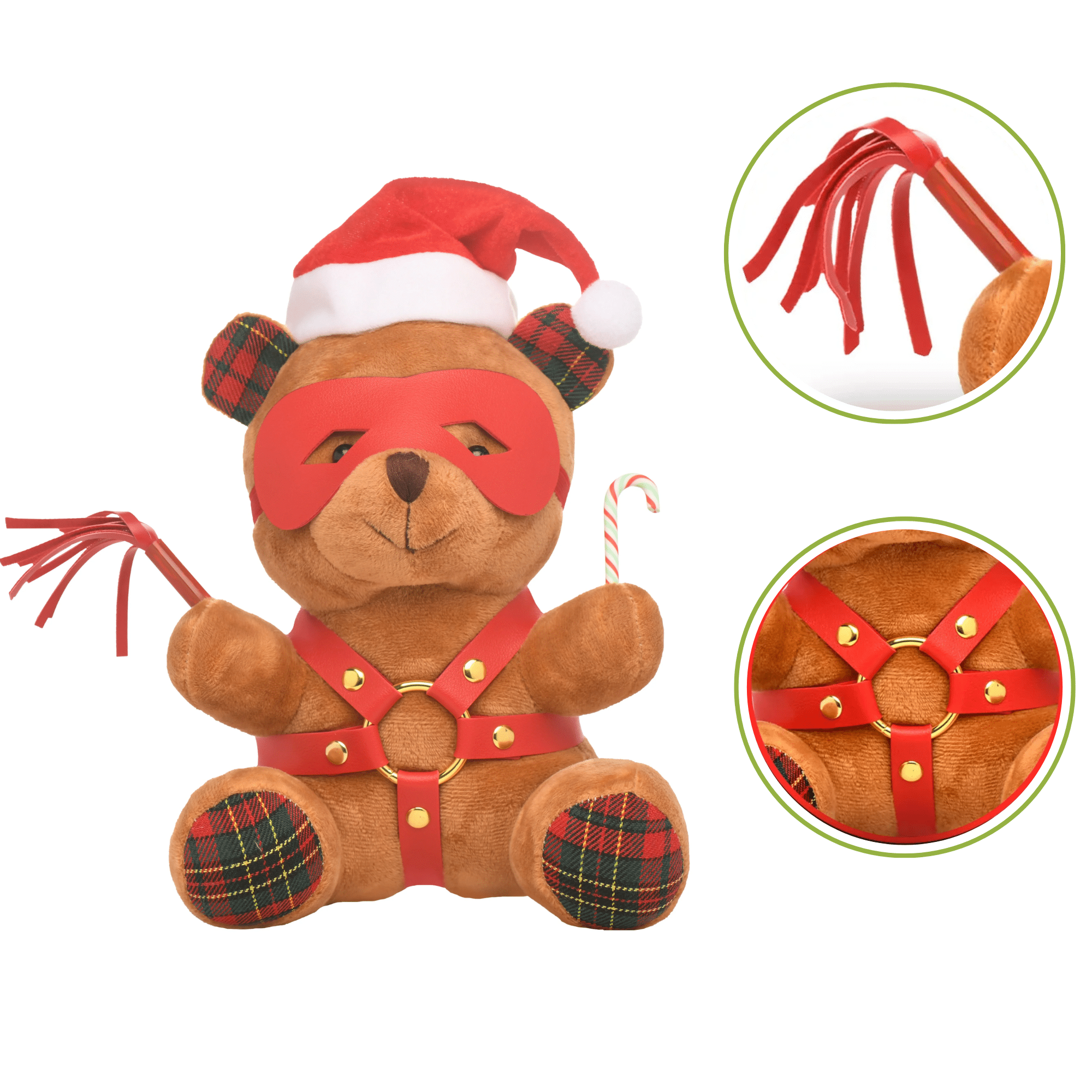 Available in Brown or White, this plush bear is designed for those who appreciate a little mischief with their cuddles. This bear radiates holiday cheer, dressed in a classic red Santa cap and featuring festive red and green flannel ears and feet. But the fun doesn’t stop there—this bear takes on a kinky persona, complete with a mask, harness, and a playful candy cane accessory.