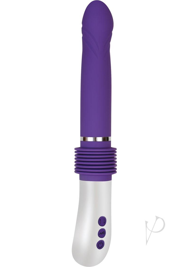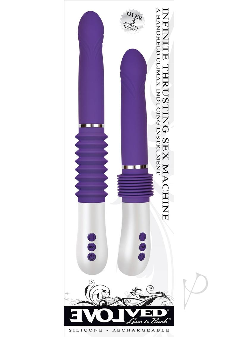 Infinite Thrusting Sex Machine Purple Vibrator. This large vibrator lets your imagination run wild with real fantasies as it thrust gently or forcefully depending on your desire. Get as close as possible to the feeling of real penetration with a luxuriously soft silicone shaft that slips in and out at the speed you choose, with intense vibrations that will send you over the end.