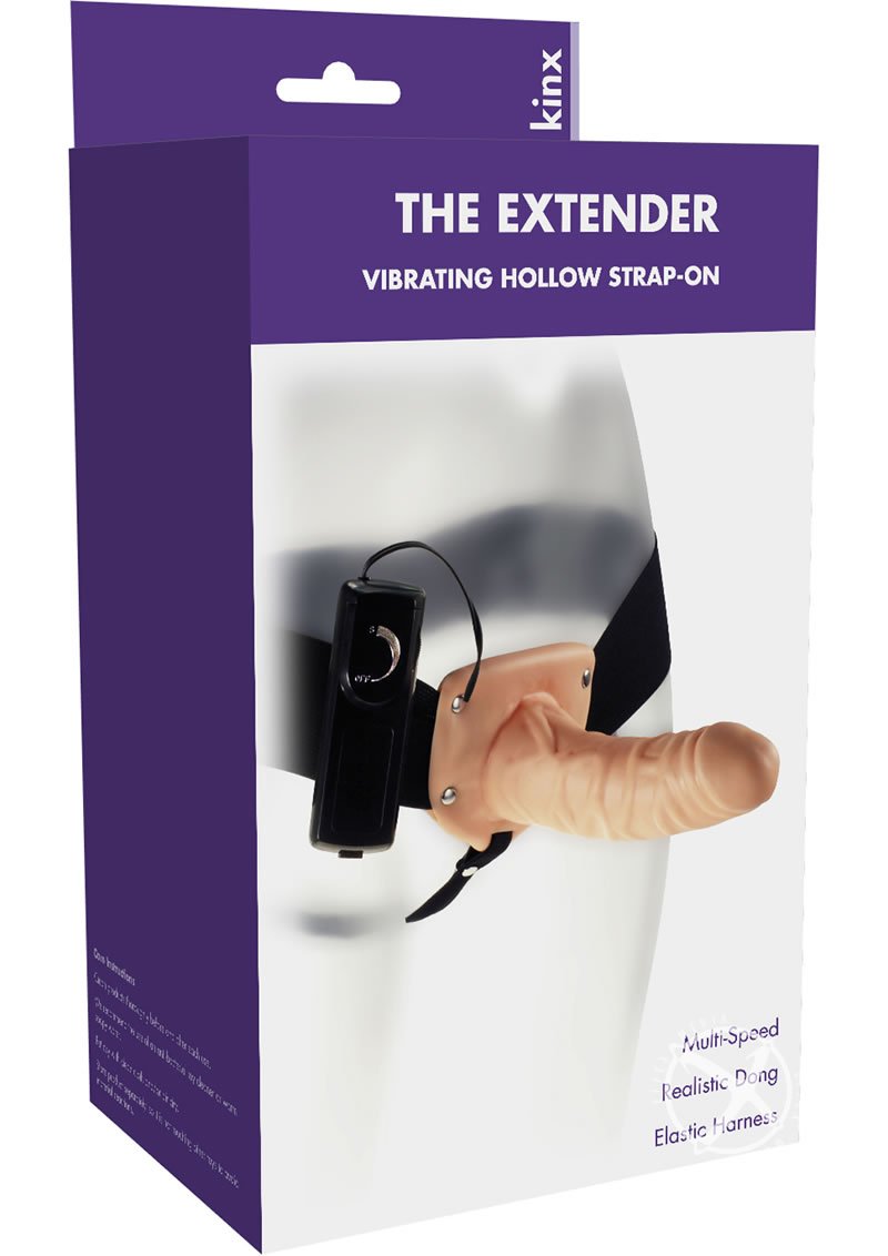 The Extender Hollow Vibrating Strap-On. This 6.5 strap-on set has a high quality dong, which is has a veined, life-like shaft. The dong has multi-speed vibration to send shivers down the spine, and all over. Importantly, the dong is hollow. This allows the wearer to himself into the dong and be in the right position to deliver some good lovin`. The harness is elasticated to allow it to fit most hips. Get ready for some everlasting love.(2AA)