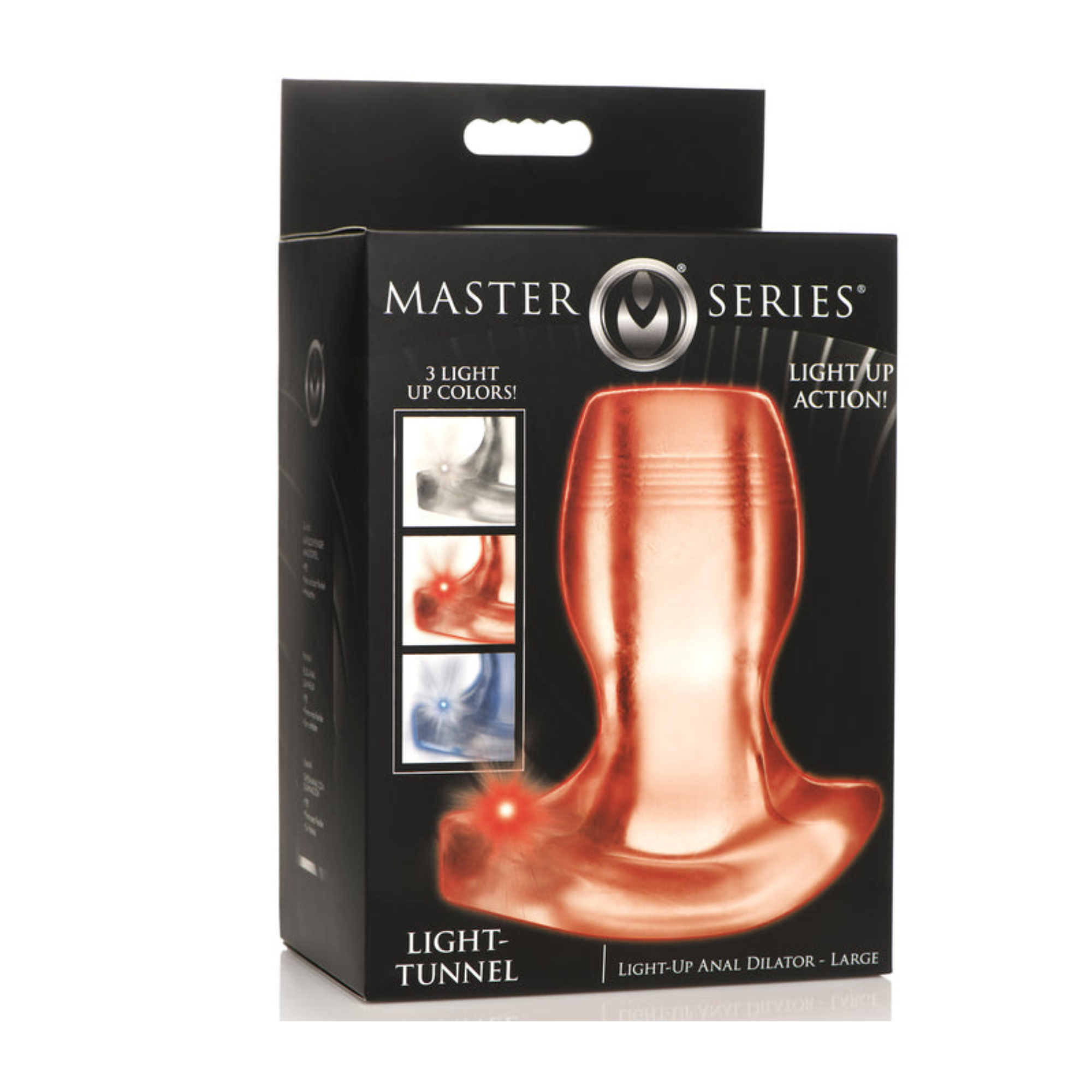 After doing any needed warm-up stretching, lube up the dilator and slip it inside. Place your fingers inside the tunnel to help guide it in until the sphincter squeezes around the neck and the toy stops at the flared base. To make things easier, have the LED light already inserted into the toy and turned on. Then enjoy pouring any fluids or liquids into the tunnel, or gaze into the gaping hole, or see if you can insert an anal-safe toy inside the tunnel for extra stimulation. Have fun with this illuminated booty and enjoy!