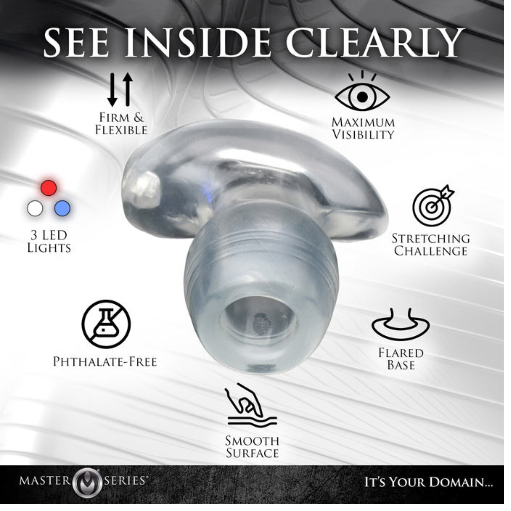You’re gonna love what’s at the end of this tunnel of light! With this light-up anal dilator, you can illuminate the clear TPE material and see inside that gaping hole as you play! This firm and flexible dilator squeezes inside experienced derrieres for a full feeling that still allows for a sturdy tunnel that you can insert other things into to get deeper inside or enjoy the gaping view! Choose between 3 different color LED lights -blue, red or white- to enjoy adding something special as you look deeper inside! The flared base makes sure it doesn’t slip too far inside and makes it safe to wear for longer periods. To clean it, remove the LED light and wash with warm water and mild soap, then rinse it off and spray with a toy cleaner before drying with a soft towel and storing in a cool, dark place. Use only with water-based or silicone-based lubricants for best results.