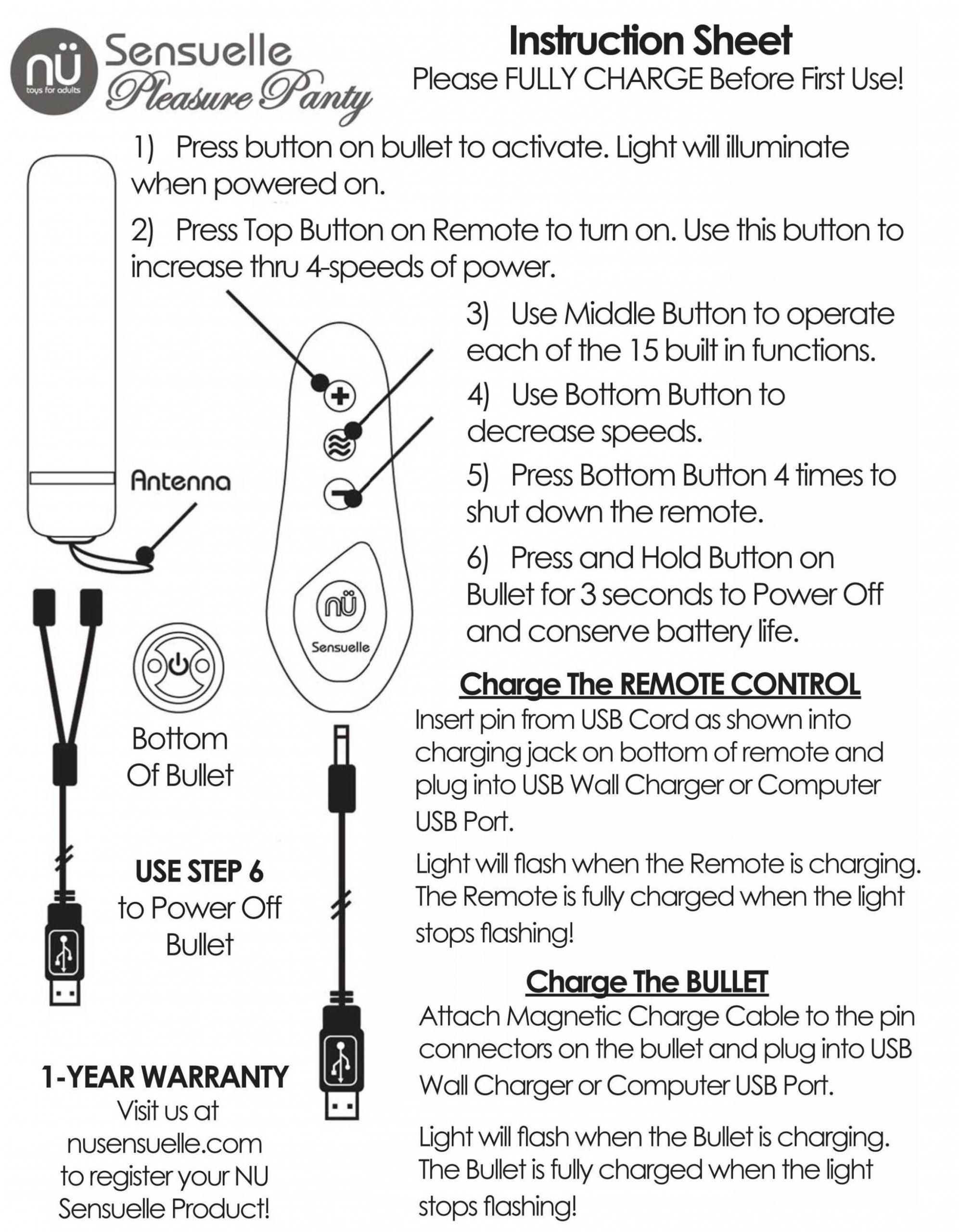 15 FunctionsnUSB Rechargeable BulletnUSB Rechargeable Remote ControlnRemote Vibrates in sync with bulletnUSB ChargenCharge time = 2 hoursnRunning time = 25-50 minutesnABS bullet coated in Medical gradeSiliconen100% Waterproof (submersible)nWhite Cotton panty with Lace detail and side ties (one size fits most)nAmazingly Powerful, yet discreet and quietnWall Charger Not Included (USB Cable Only)n1 Year warrantynToy bag included