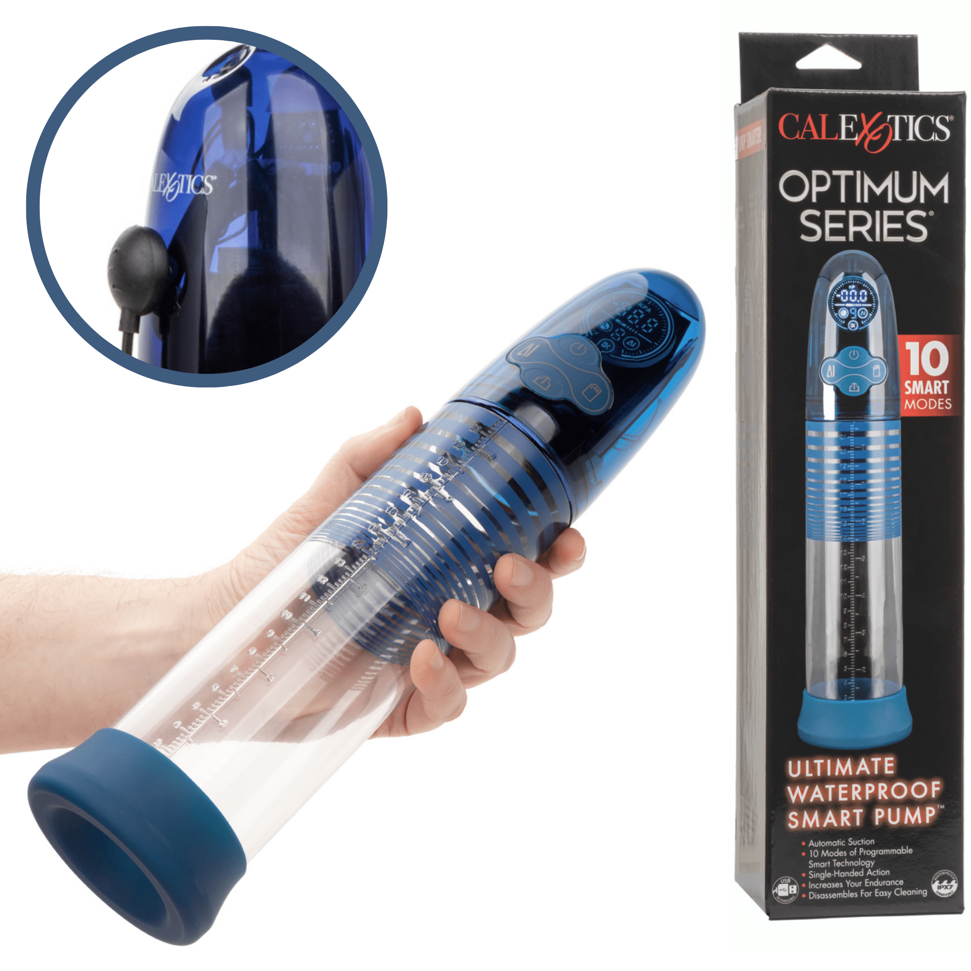 Take your pleasure and performance to unparalleled heights with the Optimum Series® Ultimate Waterproof Rechargeable Penis Extender Smart Pump. This sleek and high-tech device is designed for those who demand the best in personal enhancement. Whether in the bath, shower, or bedroom, this automatic pump delivers superior suction at the touch of a button, offering versatility and power in equal measure.