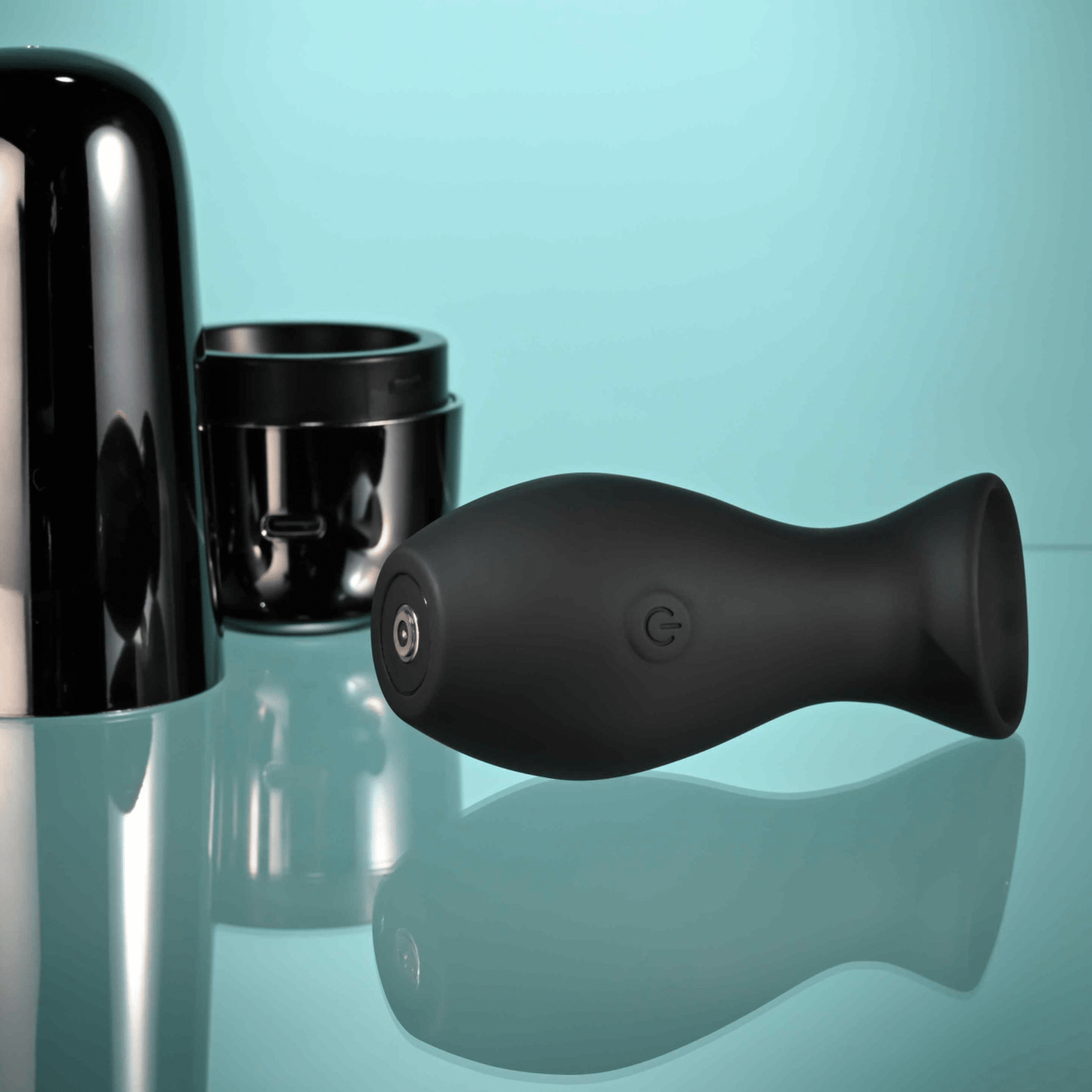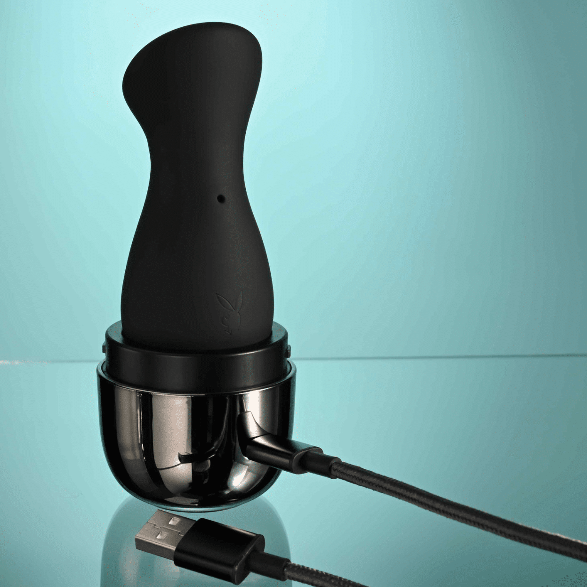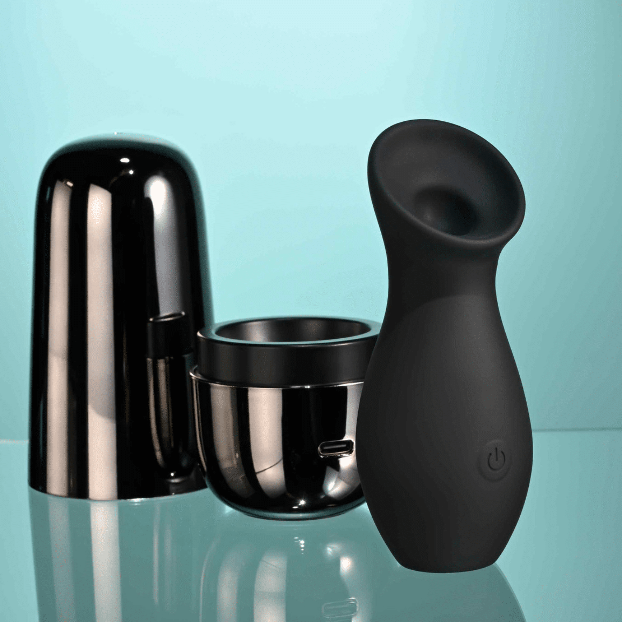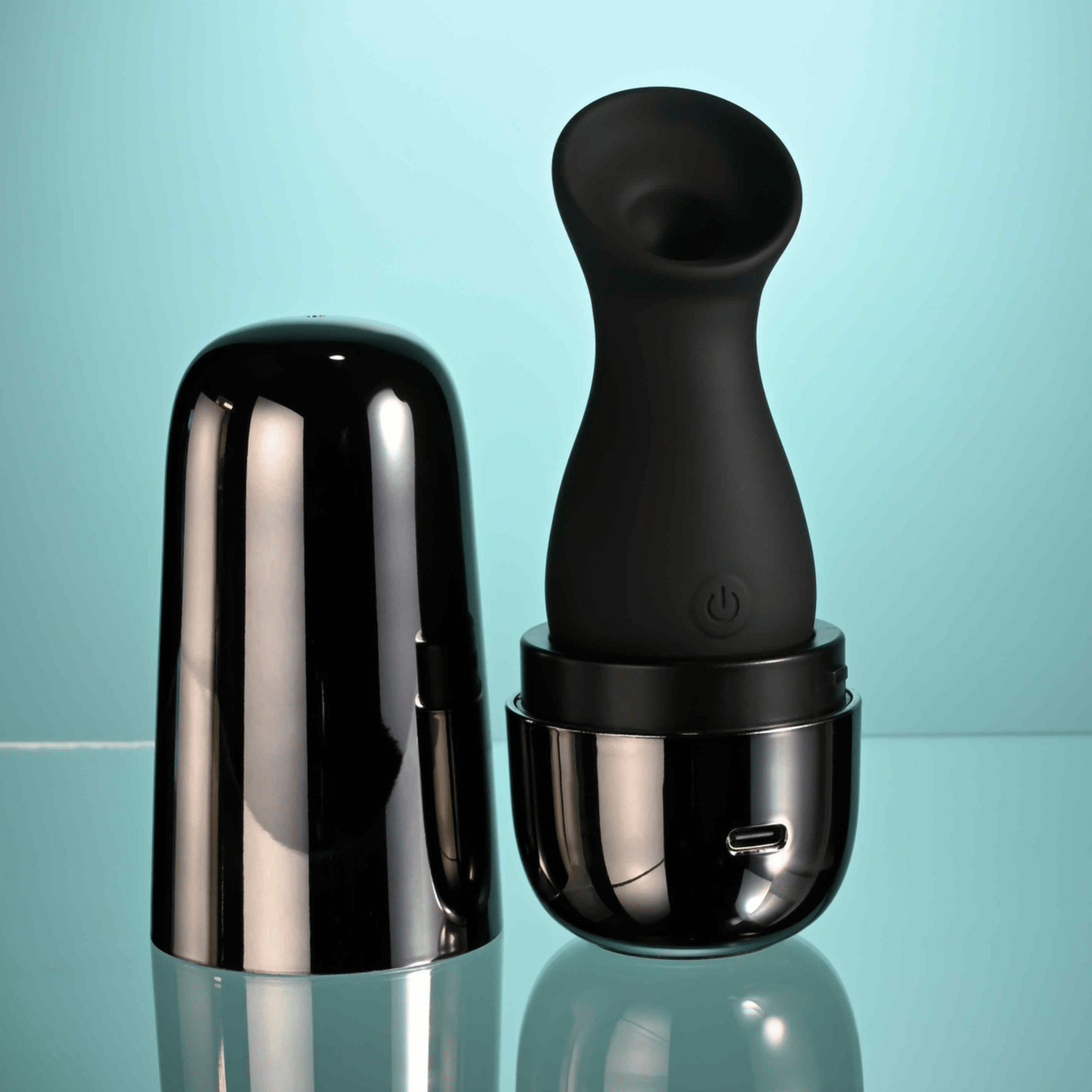 Join the Jet Set with the orgasm-inducing clitoral suction toy that offers the freedom to play wherever you go. This chic metallic black toy features a targeted suction atop a flexible tip that moves with your body, delivering intense pleasure and satisfaction. Its discreet size and sleek travel case, which charges via USB, make it the perfect companion for any adventure.