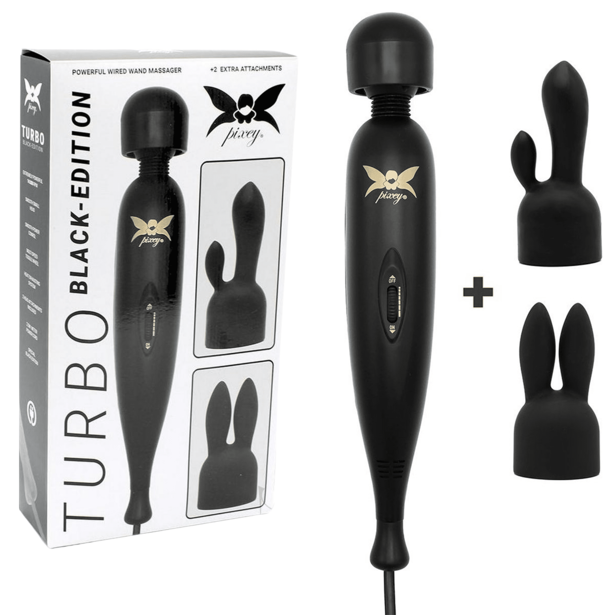 Engineered with an extremely powerful vibration motor, the updated Pixey Turbo Wand Vibrator Massager Black Edition With Two Attachments takes your pleasure and massage experience to a whole new level. Despite its compact size, this wand is one of the world’s most powerful massagers — delivering unmatched performance through a specially designed smooth head and two versatile attachments.