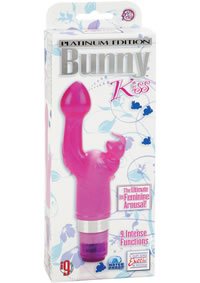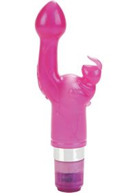 Ultimate bouncing bunny with flickering ears. Ergonomic design for G-spot stimulation. 9 intense functions of vibration, pulsation, and escalation. Easy push button control. Sized for beginners and advanced users. TPR (massager) ABS with Silver Plating (dcor) ABS (cap). 2 AAA batteries. 2.75 x 1.25/ 7 cm x 3.25 cm