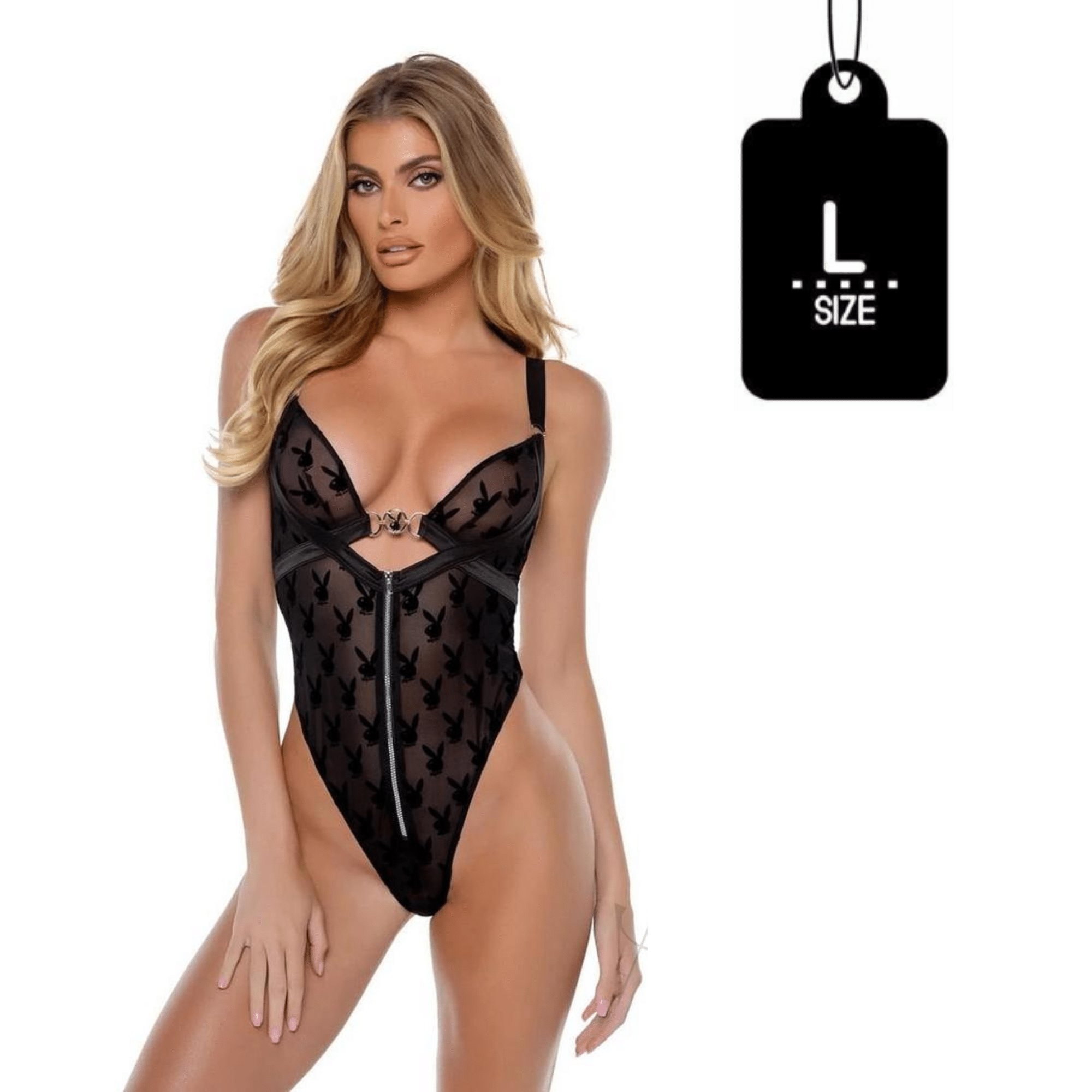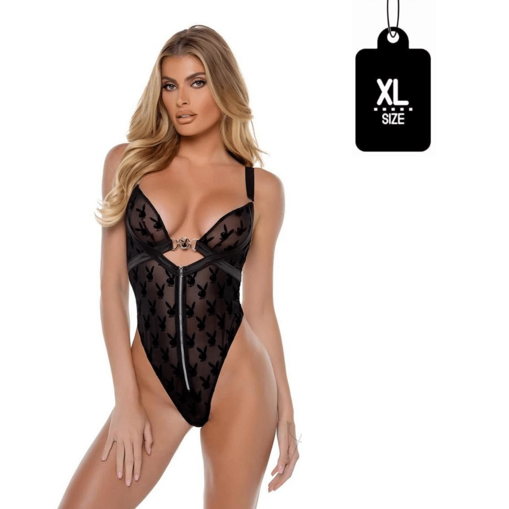 Design Features: Plunge neckline, thong back, zipper front, Bunny logo hardware