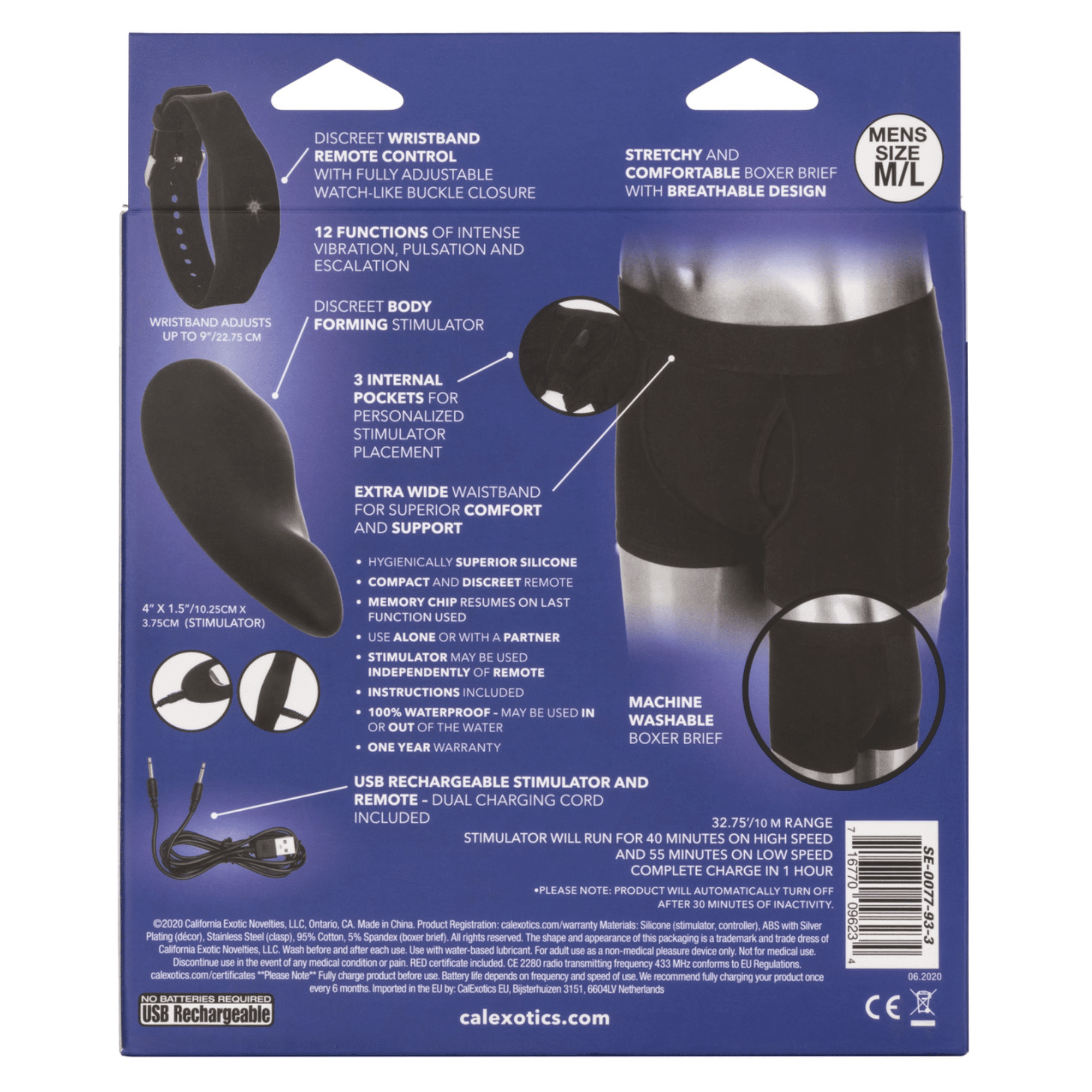 Conveniently USB rechargeable, the Remote Control Boxer Brief & Vibe Set’s vibe and remote power up via an included double USB charge cord.