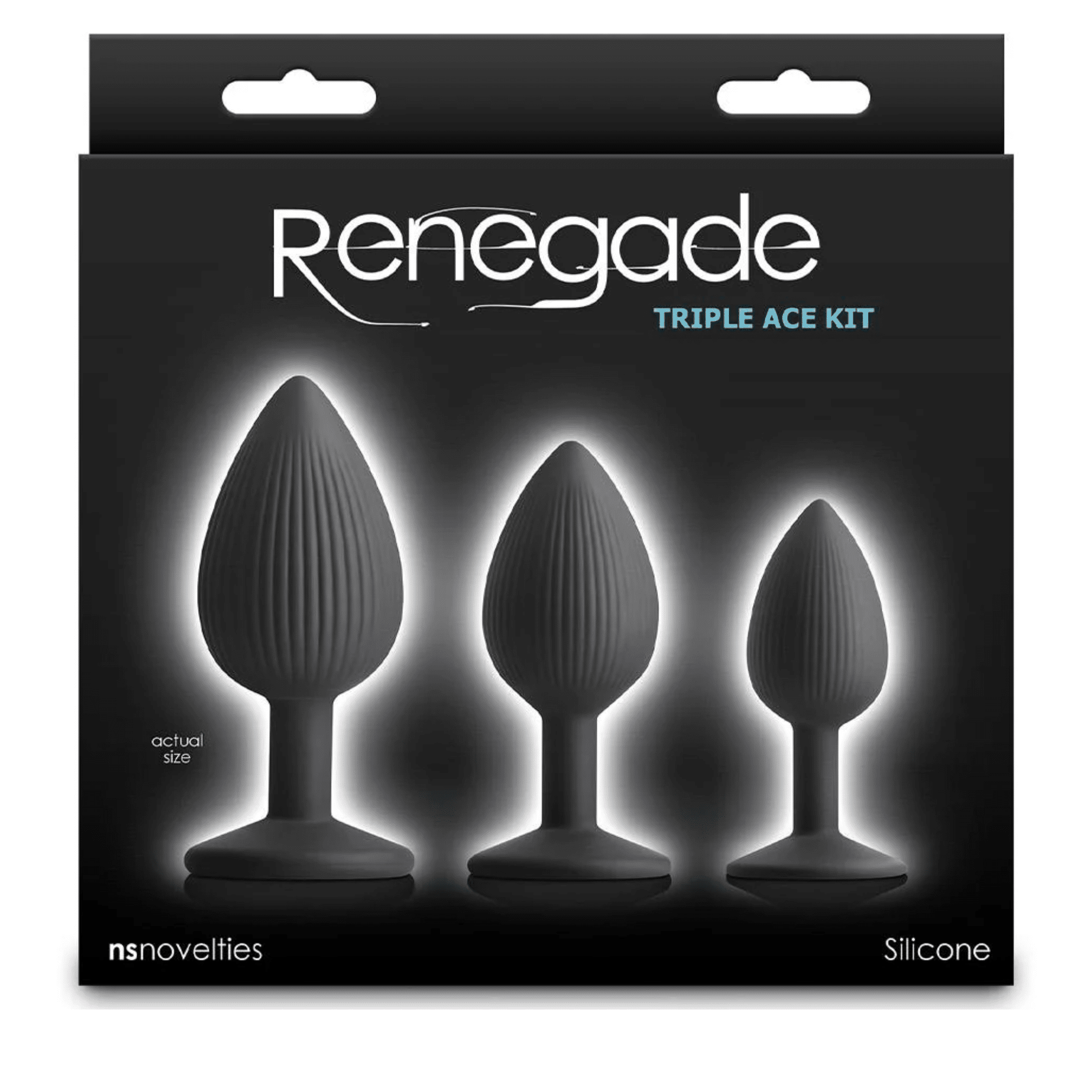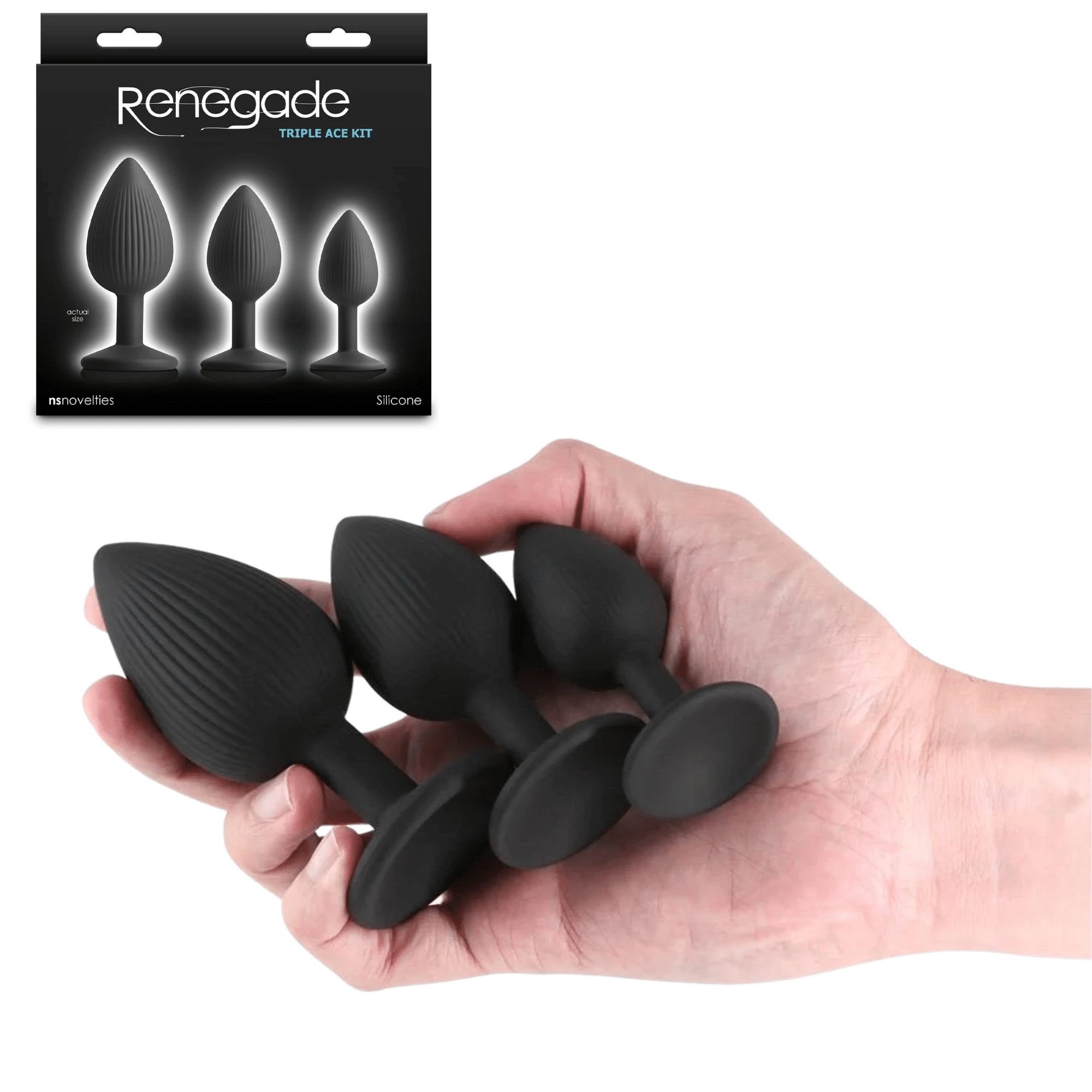 Indulge in the ultimate backdoor experience with the Renegade Triple Ace 3pc Black Silicone Butt Plugs For Beginners — a premium anal training set designed to take your pleasure to new heights. Whether you’re just starting or looking to explore new sensations, this 3-piece kit offers progressive sizing for a tailored and satisfying journey into anal play. Crafted from ultra-smooth, body-safe silicone, each plug delivers a perfect blend of firmness and flexibility for easy, comfortable insertion.