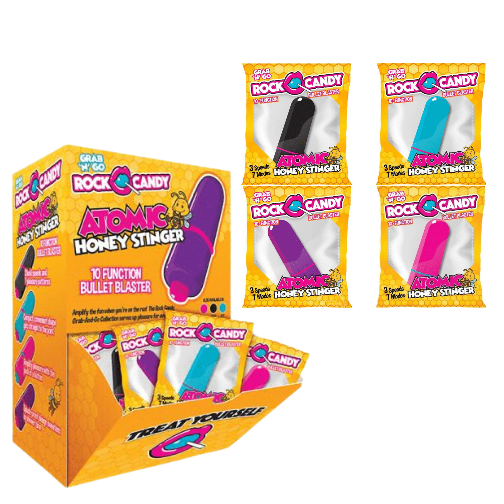 Get a banging buzz from the 10-function zinger of the Atomic Honey Stinger Bullet Blaster by Rock Candy. With simple clicks of a button, this ultra-powerful honey buzzer gets right to work hitting any of your sweet spots. Sweet on the eyes with its cute design, this toy packs a punch with its 3 thrilling speeds and 7 vibrating patterns, offering a range of sensations from comforting buzzes to dominant yet not overbearing vibes.