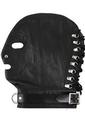 D-Ring Mask is made of soft leather, with a string tie hood and open eye and mouth holes. The adjustable collar attached comes with a D-ring and a lockable buckle strap. This Mask hoodie covers the head fully. Need two people to close it from the back. The face mask has two opening for eyes and an opening for the mouth for additional play and holes near the nostrils to avoid any discomfort. Comes in one size which can be adjusted to your neck or hair with an adjustable belt buckle. It also has a D-ring for attaching a lead.