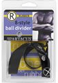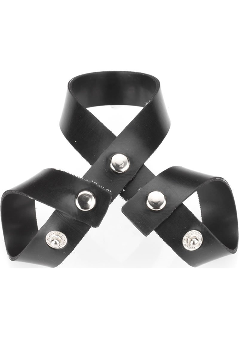Figure 8 style leather cock ring and ball divider in soft black rubber.