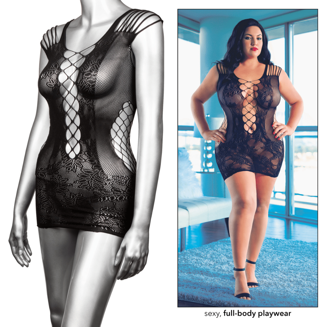 Looking to add some extra shades to your nightwear? The Scandal® Plus Size Peek-A-Boo Mini Dress is the ultimate seductive addition to your wardrobe. Crafted for those who want to tease and tantalize, this playful mini-dress is designed to highlight your most sensual assets, leaving little to the imagination.