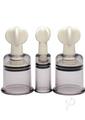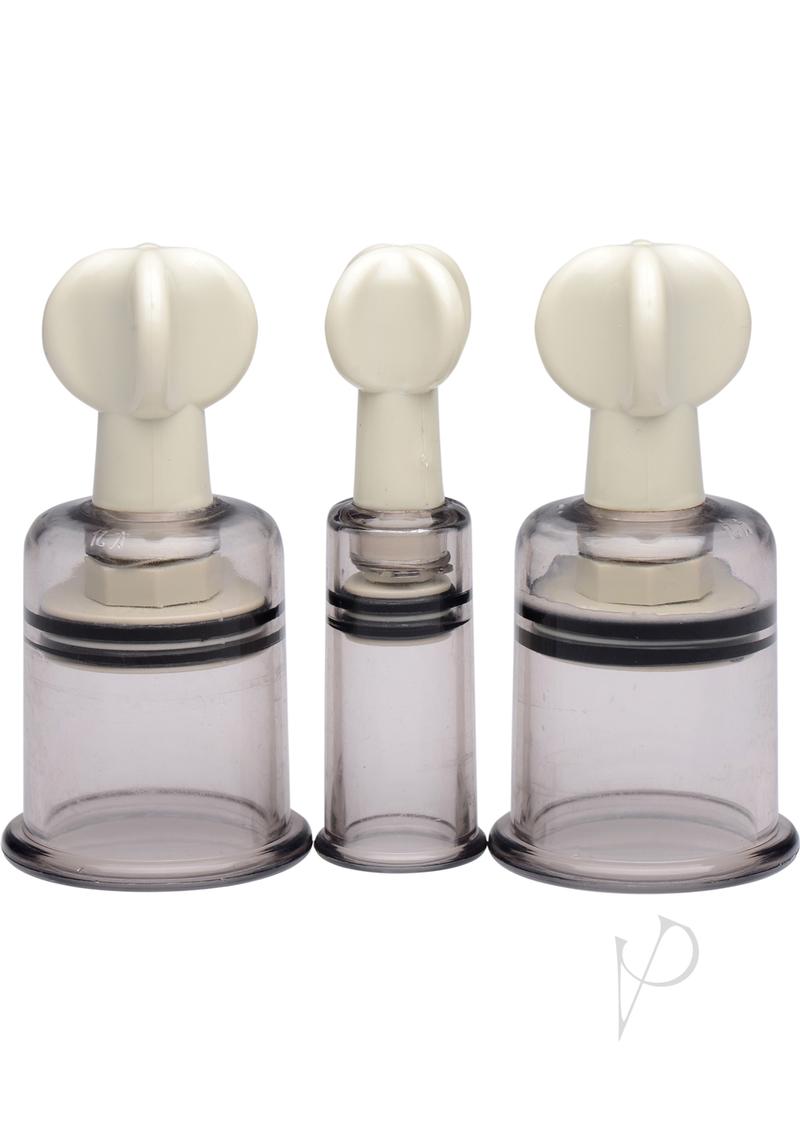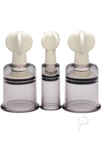 Experience powerful suction on your nipples and clitoris when you play with this easy-to-use sucker set! Without the complication of bulky tubes and pumps, this set draws blood into your desired area, engorging and enhancing sensitivity! Place each cylinder flush against the skin and use the simple twist mechanism to increase pressure within the vacuum. Experiment while you masturbate or share the excitement with a partner! Your nipples and clit will be even more responsive while they`re temporarily enlarged! Size Nipple Suckers Inner Diameter: 1.5 Maximum Depth: 1.25 Clitoral Cylinder Inner Diameter: .75 Maximum Depth: 1.25