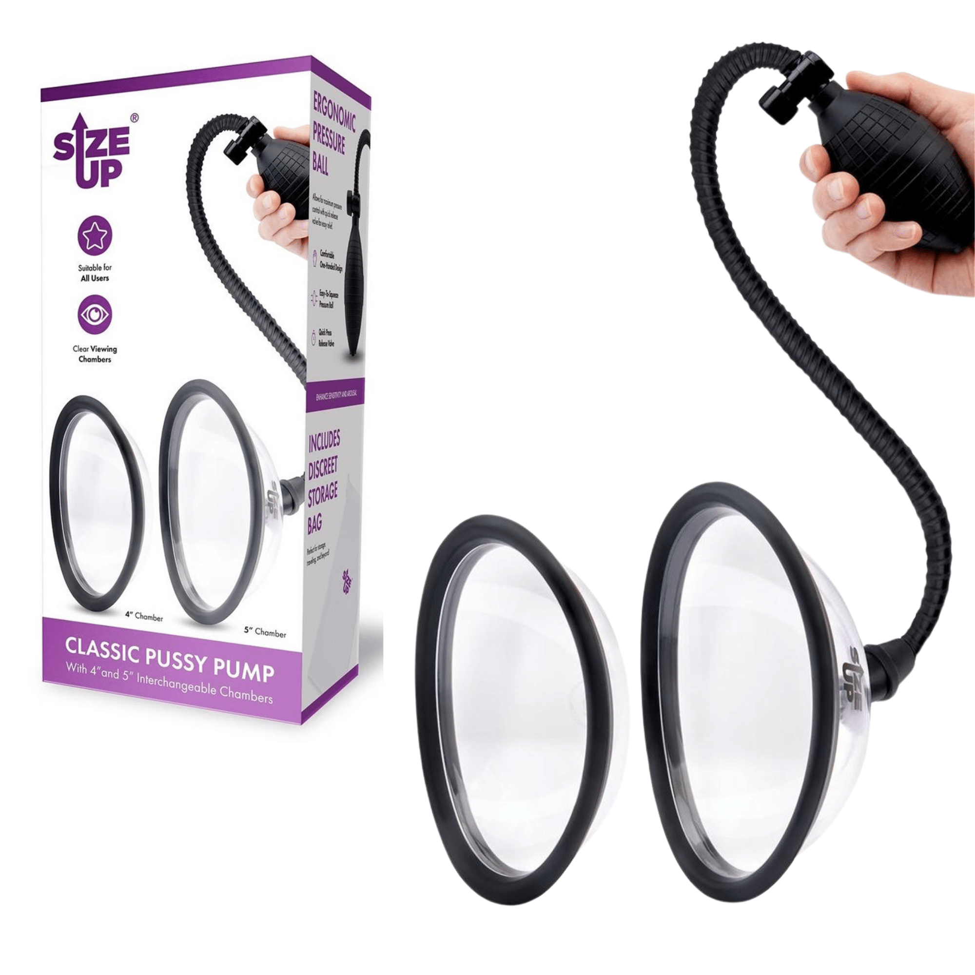 Discover a new level of pleasure with the Size Up Interchangeable Chambers Classic Suction Pussy Pump. Designed for customizable stimulation, this pump effortlessly switches between two different cup sizes (4-inch and 5-inch), ensuring the perfect fit every time. Whether you’re seeking a gentle enhancement or a more intense experience, it’s easy-to-use suction mechanism gives you complete control.