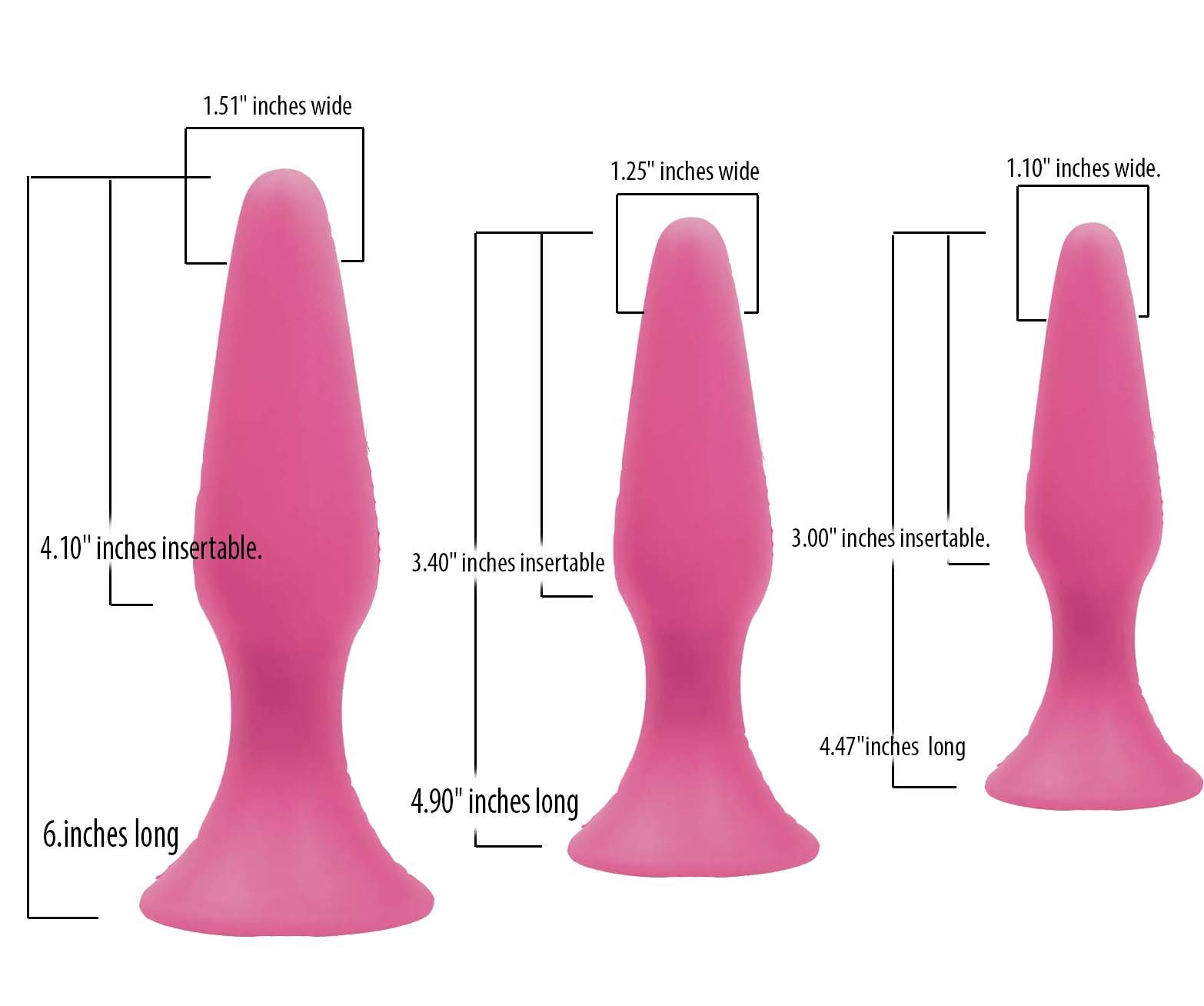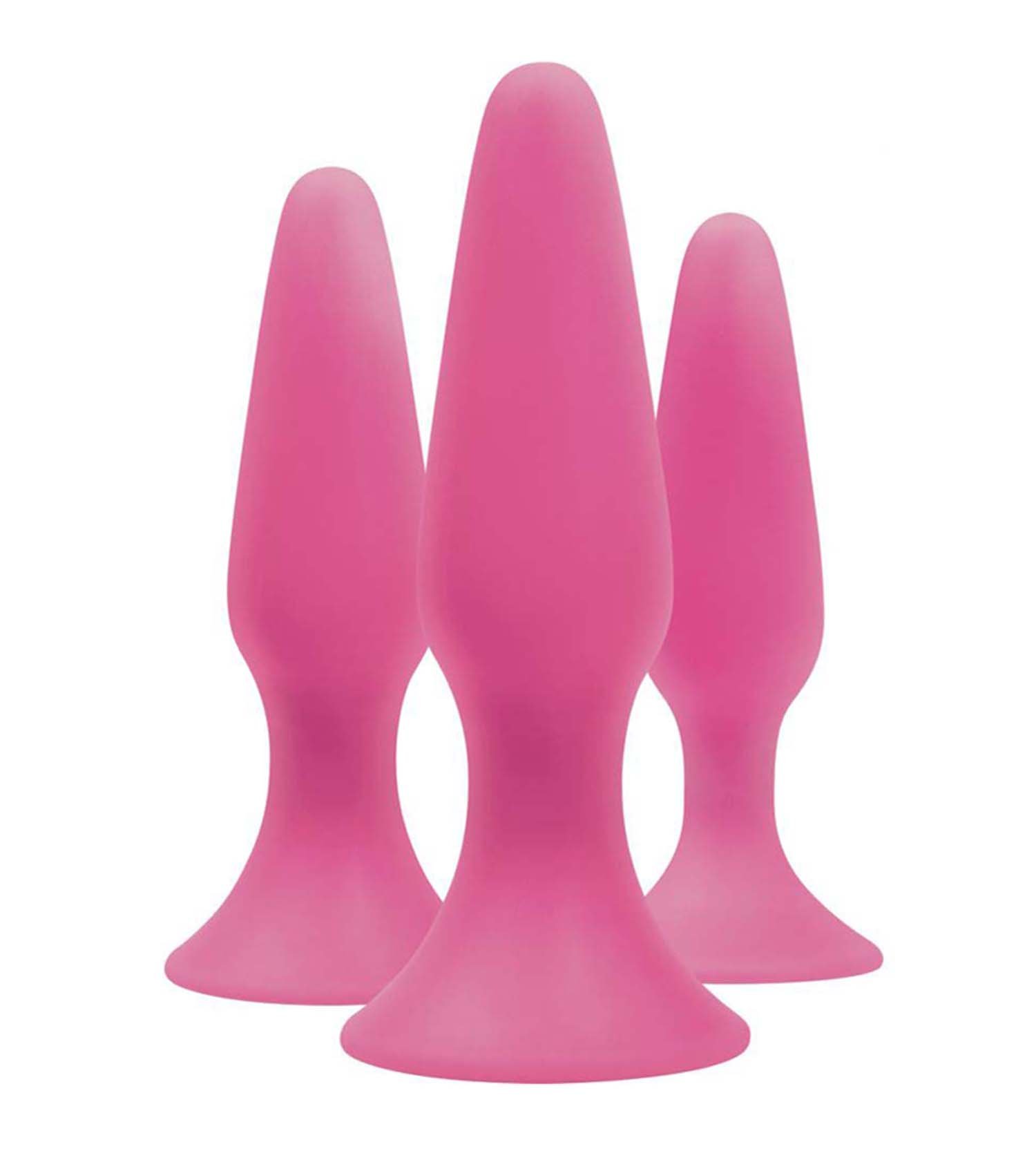 The Sliders Trainer Kit includes three assorted sizes of firm, flexible and tapered plugs designed for effortless penetration. Velvety soft to the touch, these satin finish toys are easy to clean and safe to use with any lubricants. Each features a strong suction cup base for creative sexual fun.