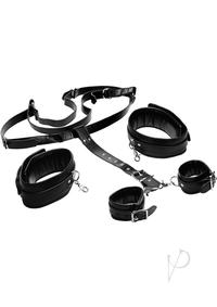 Get your play thing into the perfect position for penetration! Spread those legs open and restrain those wrists! This highly adjustable bondage sling will create a darkly seductive atmosphere for you and your lover to enjoy. Adjust the back strap to bring their wrists up or down their back. Bring their knees up to their chest with the thigh strap to leave them completely vulnerable and exposed. The padded cuffs will keep them comfortable through the long hours of your pleasing, teasing, and tormenting! Each of the buckles locks, if you wish, to further incarcerate your submissive lover. Take control of the evening when you strap your lover into this durable and sexy sling!Material: PU leather, metal.Color: Black.Note: Heavy duty restraints. Locks not included.