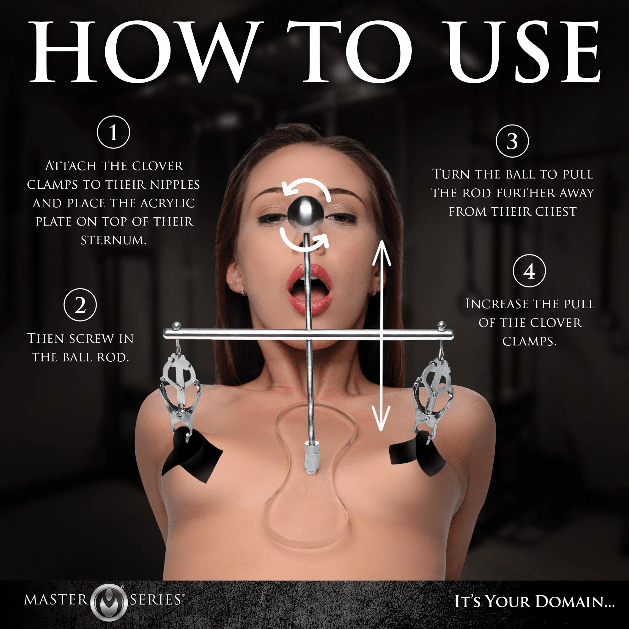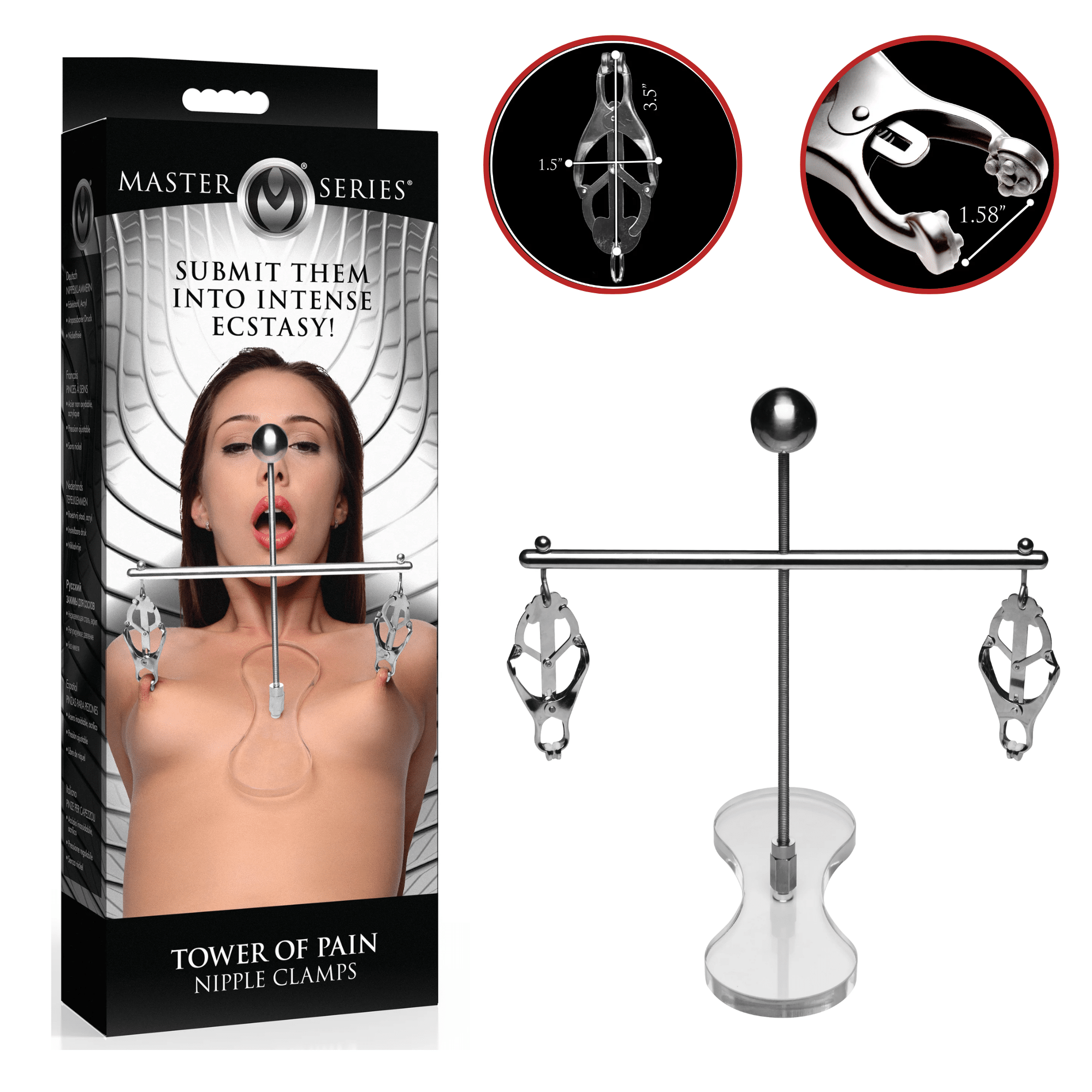 Imagine the possibilities: Lay them back, bare-chested, with nipples exposed. Place the acrylic platform on their chest and attach each clamp to the nipples. Gently grab the nipple and clamp onto the areola, releasing slowly to increase the intensity. As they acclimate to the sensation, adjust the tower’s height to amplify the experience. With every movement, the pressure intensifies, holding them captive in an exhilarating Tower of Pain.