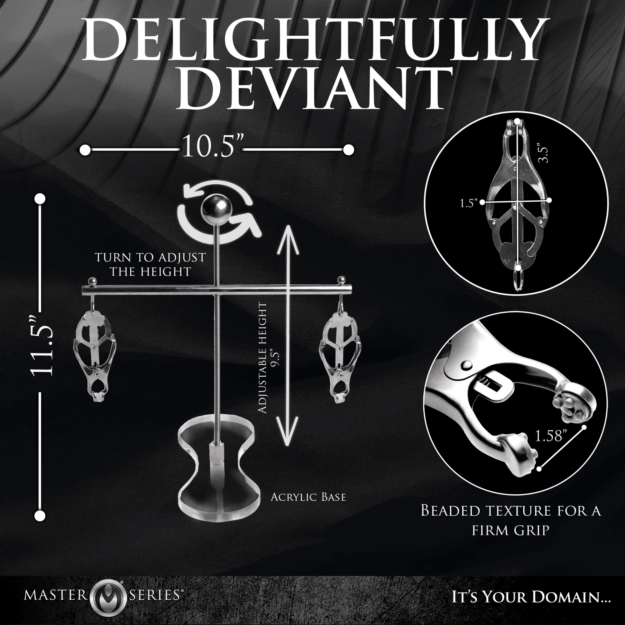 Put your submissive in a predicament pose they can’t escape with the Tower of Pain Stainless Steel Adjustable Nipple Clamps! This uniquely designed tower features clover-style nipple clamps that increase in pressure when pulled on, delivering an intense and unforgettable experience. The rubber tips ensure skin protection, while the wicked pressure provides the perfect amount of torment. Designed to fit all body types, the tower is adjustable in height, allowing you to find the ideal position for your play.