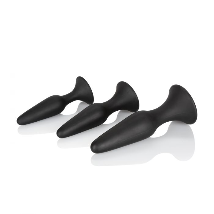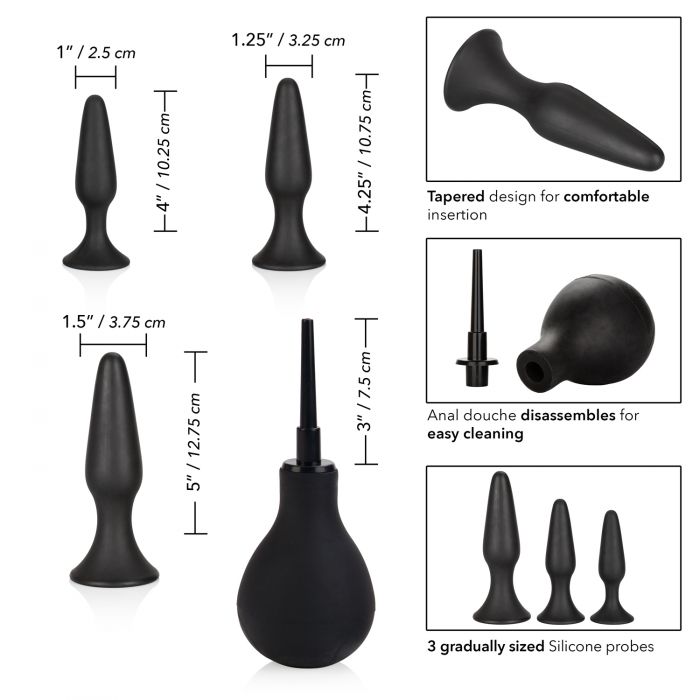 Open the door of thrilling anal sensation with the Ultimate Anal Kit. This kinky kit includes a set of 3 graduated anal plugs and a large enema bulb to let you safely and comfortably enjoy passionate anal stimulation. To enjoy everything the exhilarating world of anal play has to offer, training is needed in order to ensure total safety and satisfaction. Our tapered silicone plugs allow you to gently increase the size of your pleasure as you tease and train.nnWhile each increase of your training expands your horizons, use the convenient suction cup base for hands-free stimulation, effortless ion and gentle removal. Never again worry about little accidents spoiling the mood, instead, allow the silicone enema bulb to give you a superior cleaning experience. Effortlessly control water flow and stimulation with this EZ squeeze enema bulb. nnThe flexible probes are made from a hygienically superior silicone. This body safe material is unscented and phthalate free to keep your most sensitive spots happy and healthy.nnDimensions:nBulb: 4.5 x 3 in.nLarge Probe: 5 x 1.5 in.nMedium Probe: 4.25 x 1.25 in.nSmall Probe: 4 x 1 in.nTip Attachment: 3 in.nPackage: 3.25 x 4.5 x 8.75 in.