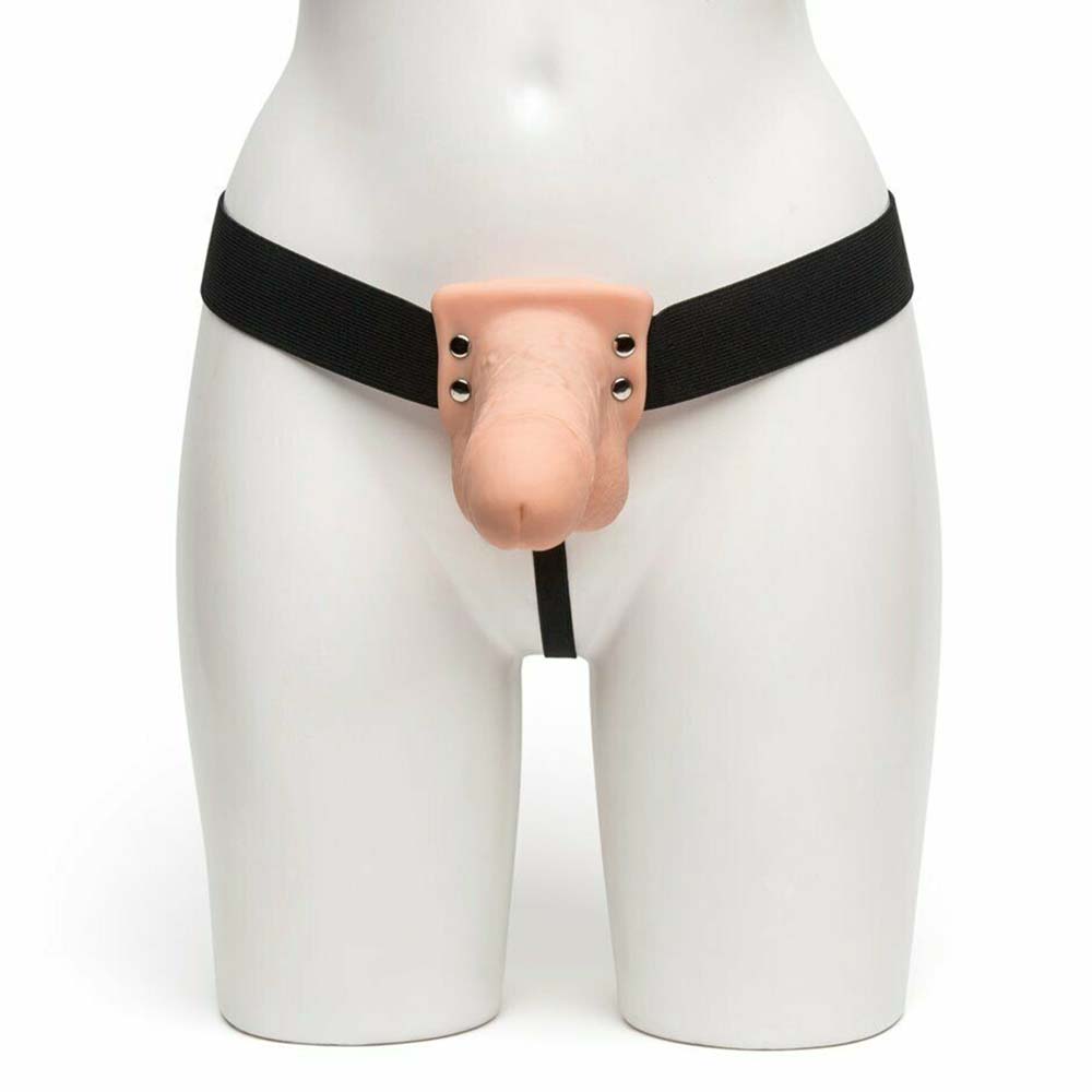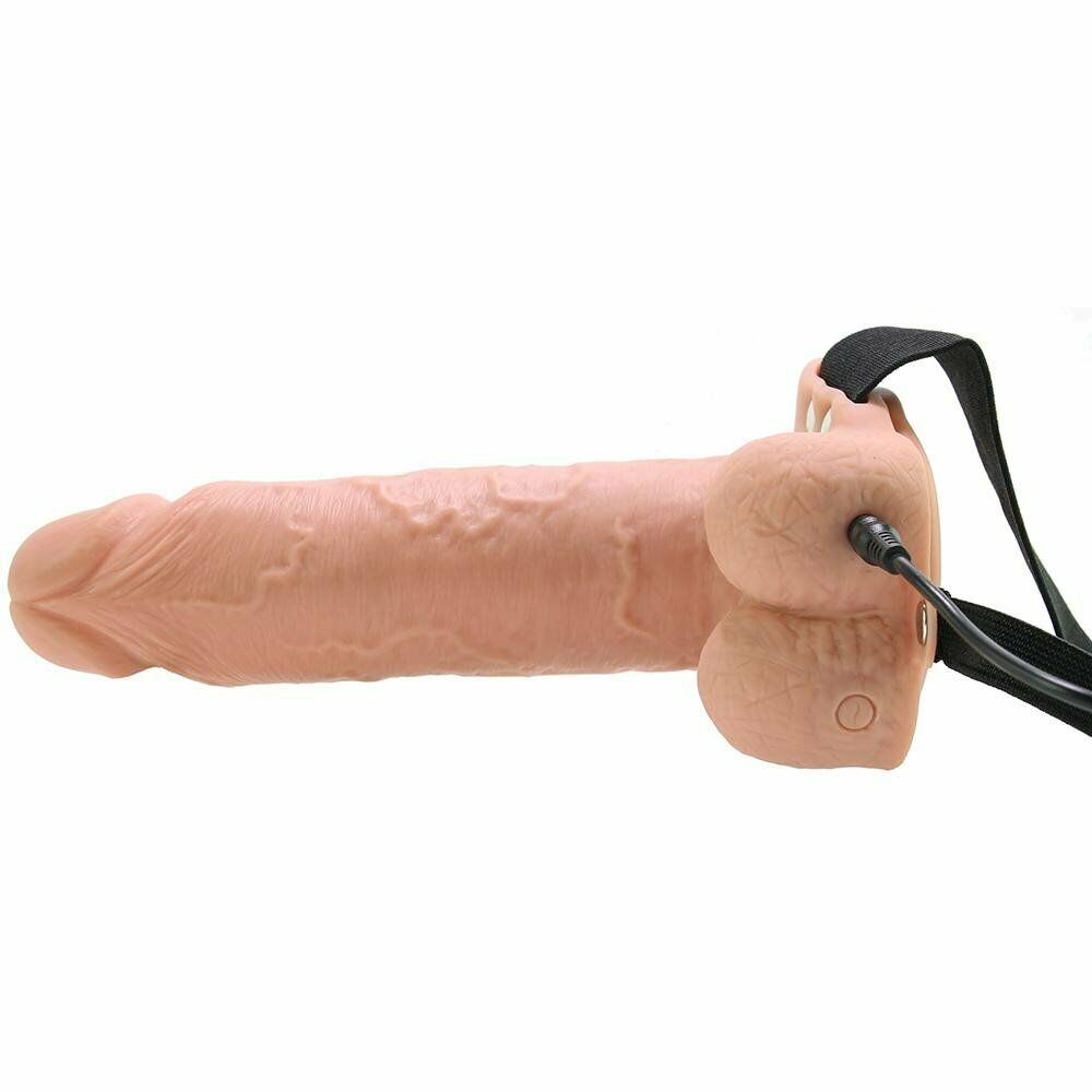 The rechargeable hollow strap-on is ready to go when you are, and you`ll never have to worry about changing batteries again. Press and hold the button on the left testicle for three seconds to power on, then press the button again to cycle through ten thrilling pulsation patterns.